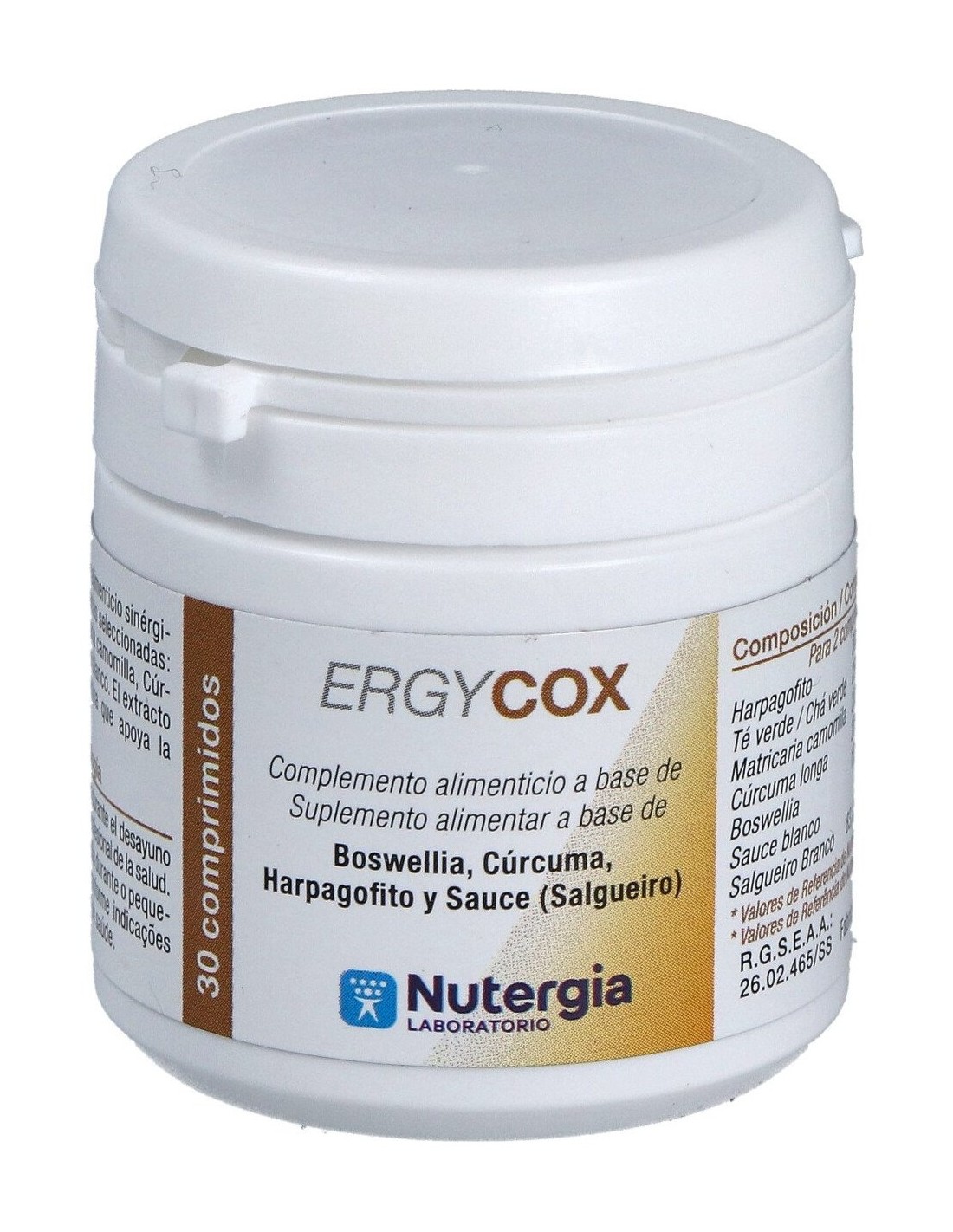 Extracto seco de Harpagofito (Harpagophytum procumbens (Burch.) DC., 2% Harpagosidos), celulosa microscristalina y fosfato bicálcico dihidratado, extracto seco de Té verde (Camellia sinensis (L.) Kuntze, 95% polifenoles, 70% catequinas, 40% EGCG (Epigalocatequina-3-Galato), extracto seco de Matricaria camomilla (Matricaria recutita L., 1% flavonas), extracto seco de Cúrcuma longa (Curcuma longa L., 50% curcuminoides), extracto seco de Boswellia (Boswellia serrata Roxb. Ex Colebr, 10% ácidos boswélicos) y extracto seco de Sauce blanco (Salix alba L., 25% Salicina), estearato de magnesio y dióxido de silicio.