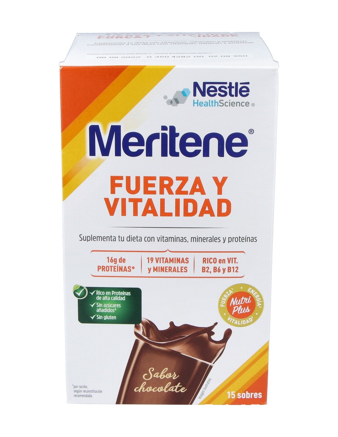 El suplemento nutricional se presenta en sobres o en bote. Para preparar un sobre de Meritene diluya el contenido del sobre en 200 ml de leche entera o descremada. Si se utiliza el bote, vierta 3 cucharadas (aprox. 30 g) en 200 ml de leche semidesnatada (o agua) caliente o fría. posteriormente remueva o agitar enérgicamente el envase.