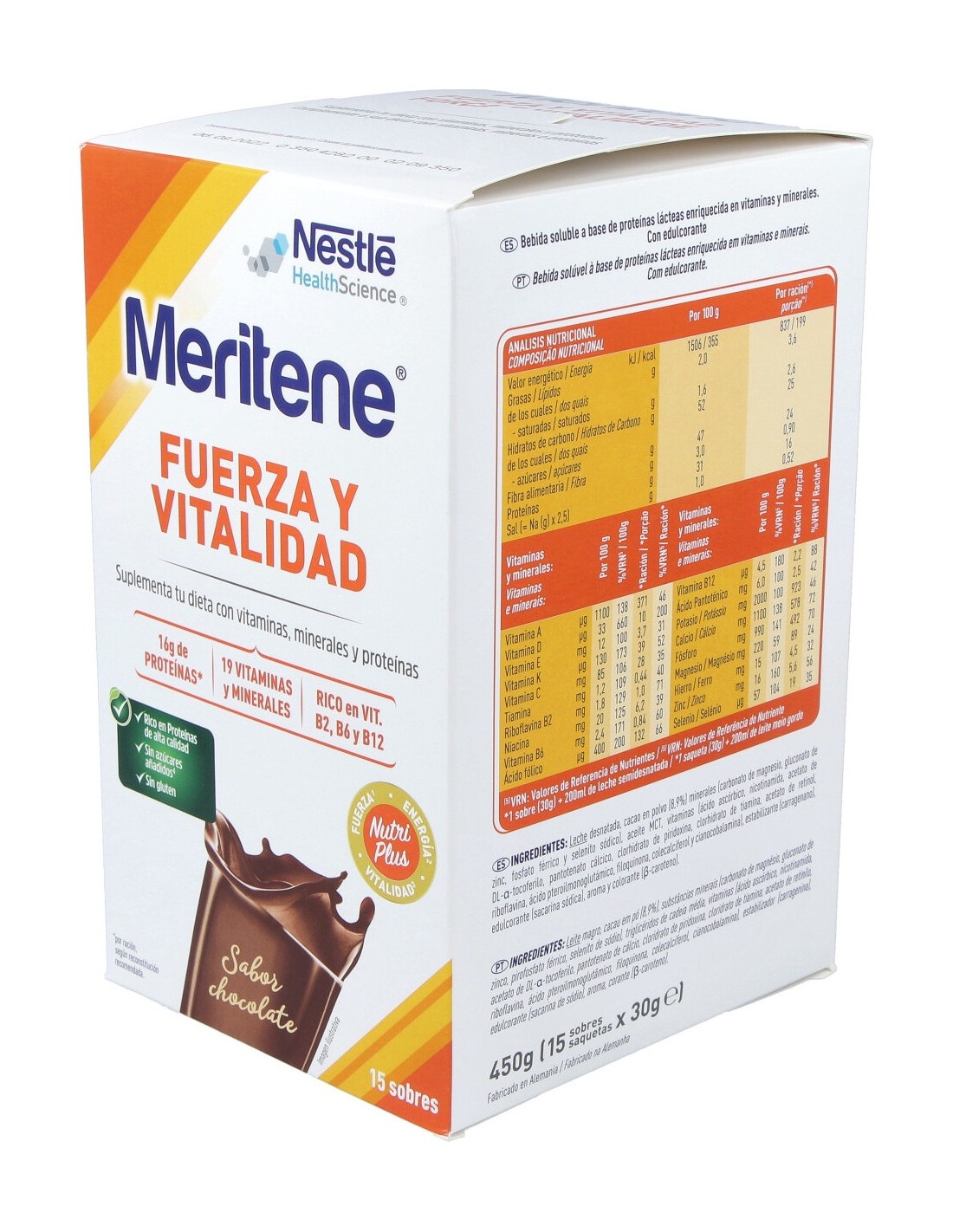 - Sabor chocolate contiene leche desnatada, cacao en polvo (8,9%), minerales (carbonato magnésico, gluconato de zinc, fosfato férrico y selenito sódico), aceite MCT, vitaminas (ácido ascórbico (C), nicotinamida (niacina), DL acetato de DL alfa tocoferilo (E), pantotenato cálcico (ácido pantoténico), clorhidrato de piridoxina (B6), clorhidrato de tiamina (B1), acetato de retinol (A), ácido pteroilmonoglutámico (ácido fólico), riboflavina (B2), filoquinona (K), colecalciferol (D) y cianocobalamina (B12)), estabilizante (carragenano), edulcorante (sacarina sódica), aroma y colorante (beta caroteno).