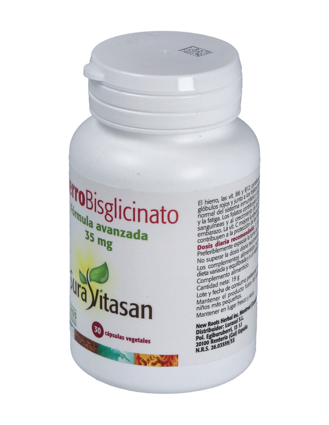 Complemento nutricional en cápsulas a base de hierro, vitamina C, vitaminas del grupo B y cobre que contribuyen al metabolismo normal del hierro. Aporta 35mg de hierro procedente de bisglicinato ferroso, una forma de hierro bien tolerada y de alta biodisponibilidad, por cápsula. El hierro es fundamental para la formación de glóbulos rojos y hemoglobina en la sangre. Las vitamina B6 y B12 contribuyen al funcionamiento normal del sistema inmunitario y ayudan a disminuir el cansancio y la fatiga.