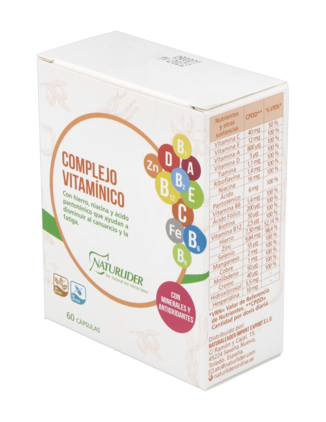 Complemento alimenticio compuesto por 12 vitaminas y 7 minerales, en sus formas más activas y biodisponibles. Con fuentes naturales de vitaminas y minerales y enriquecido con polifenoles de olivo y hesperidina.