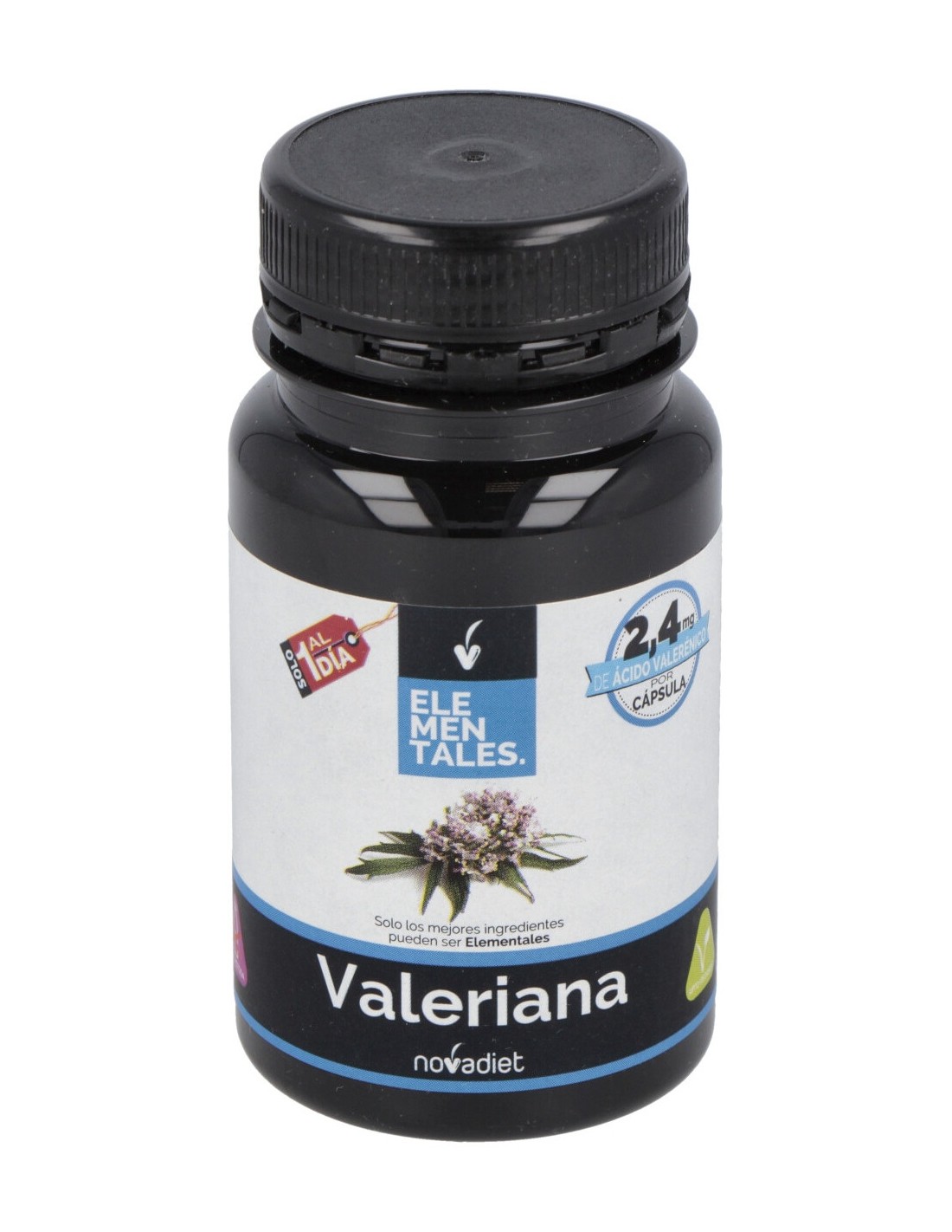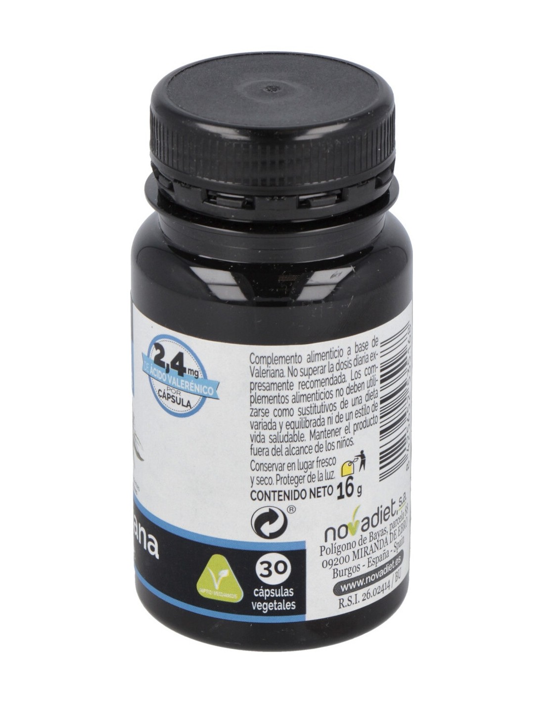Valeriana (Valeriana officinalis L., raíz, E.S., ratio 9-3:1, titulado a = 0,8% en ácido valerénico), Agente de carga (celulosa microcristalina), Antiaglomerantes (estearato de magnesio, dióxido de silicio). Cubierta: Agua, Hidroxipropilmetilcelulosa.