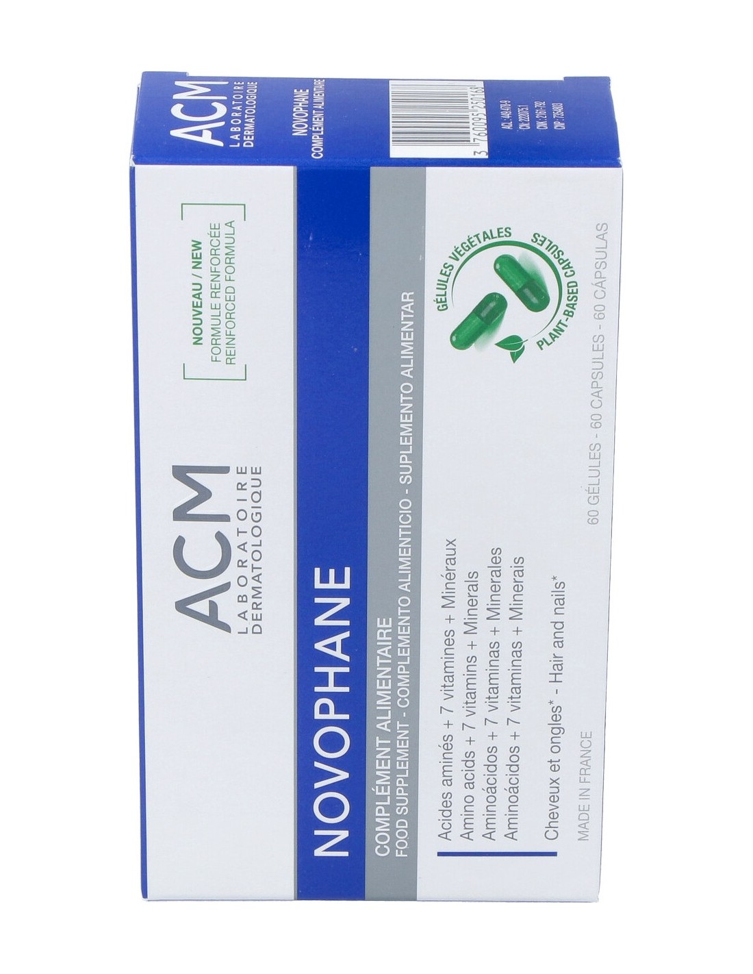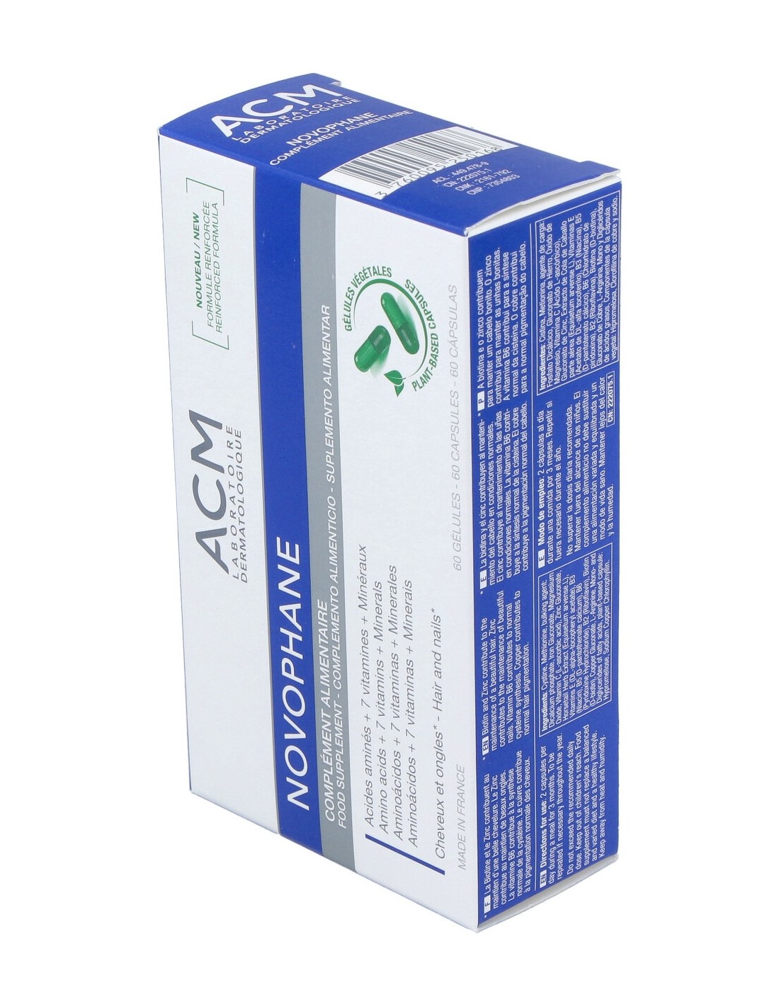 Cistina, Metionina, agente de carga: Fosfato Dicálcico, Gluconato de Hierro, Óxido de Magnesio, Vitamina C (Ácido L-ascórbico), Gluconato de Cinc, Extracto de Cola de Caballo parte aérea (Equisetum arvense L.), vitaminas E (acetato de DL-alfa tocoferilo), B3 (Niacina), B5 (D-pantotenato cálcico), B6 (Clorhidrato de piridoxina), B2 (Riboflavina), Biotina (D-biotina), Gluconato de Cobre, L-Arginina, Mono y diglicéridos de ácidos grasos. Componentes de la cápsula vegetal: Hipromelosa, Clorofilina de cobre y sodio.