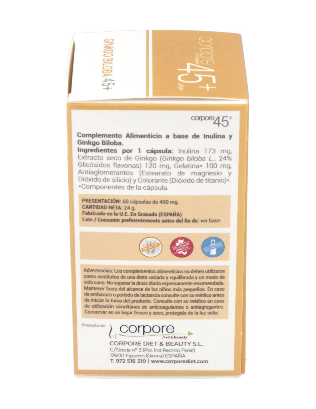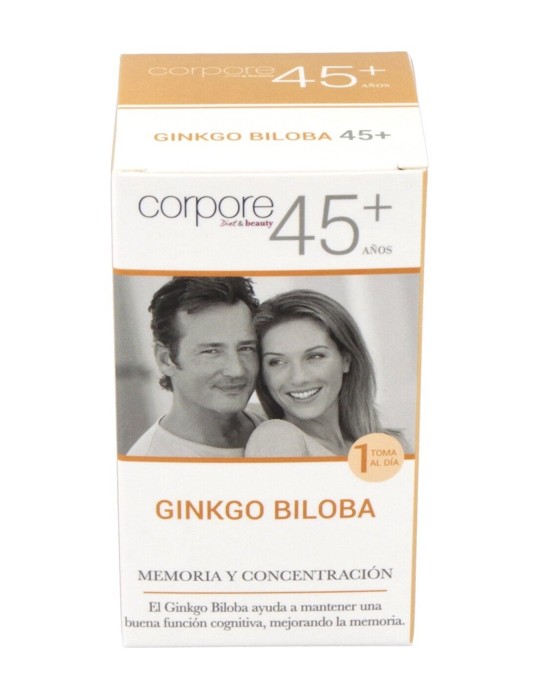Corpore+45 Ginkgo Biloba 60caps es un complemento alimenticio a base de Ginkgo Biloba, un árbol con muchos fines terapéuticos que ayudan a aumentar la circulación sanguínea central y periférica y a la irrigación de los tejidos orgánicos. Además, también potencia la concentración y ayuda a tratar trastornos de memoria, dolor de cabeza y cambios de humor. Asimismo, también contribuye a aliviar los síntomas de la menopausia.