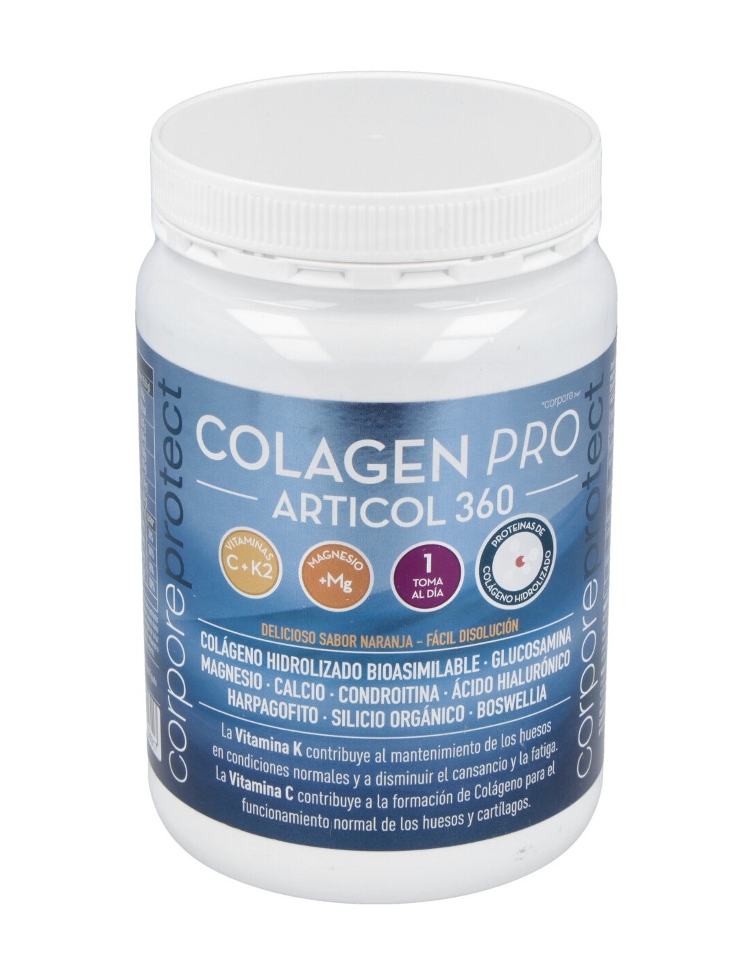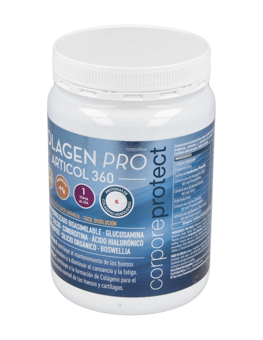 Corpore Protect Colagen Pro - Articol 360 - 300g es un suplemento que aporta un extra de Colágeno al organismo. Su fórmula combinada de Harapagofito, Condroitina, Magnesio y Bowelia, ayuda a reducir el dolor y la inflamación en las articulaciones. El Harapagofito actúa cómo antinflamatorio, la Condroitina alivia los dolores artríticos y el Magnesio previene el deterioramiento de los tejidos musculares y los calambres musculares. Además, aporta Vitamina C, Vitamina K2, Ácido Hialurónico y Silicio orgánico.