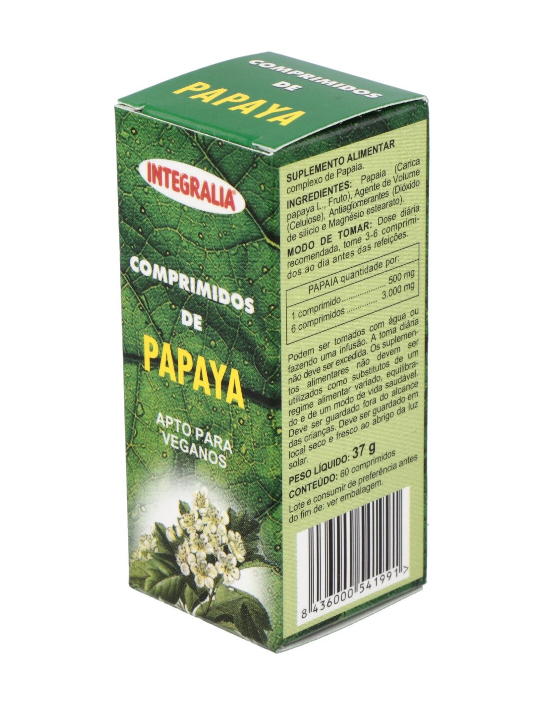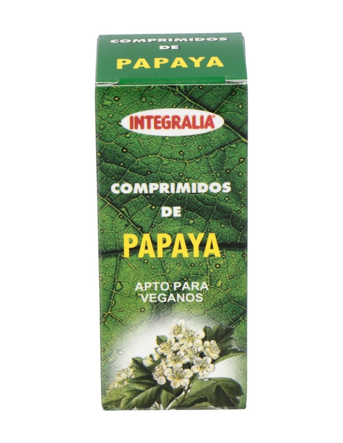 Integralia une los beneficios de la papaya en este producto, que resulta ideal para la digestión de los alimentos. El contenido de papaína ayuda a descomponer las proteínas en partículas más pequeñas para que se digieran mejor. Aquellos alimentos como las carnes o los ingredientes pesados que no son fáciles de digerir necesitan un complemento para el correcto funcionamiento del organismo. Es un laxante suave para el estreñimiento. Rico en betacaroteno. La papaya contiene propiedades que permiten quitar parásitos intestinales y reforzar el contenido de vitaminas. Además, calma dolores, alivia el colon irritable, alcaliniza el organismo en casos de acidosis y demás virtudes. Ideal para casos de gastroenteritis y colitis gracias al efecto suave y antiséptico sobre los intestinos. Contiene vitamina A y C, potasio, fibra, complejo B, ácido fólico, magnesio, calcio y hierro. Color anaranjado.