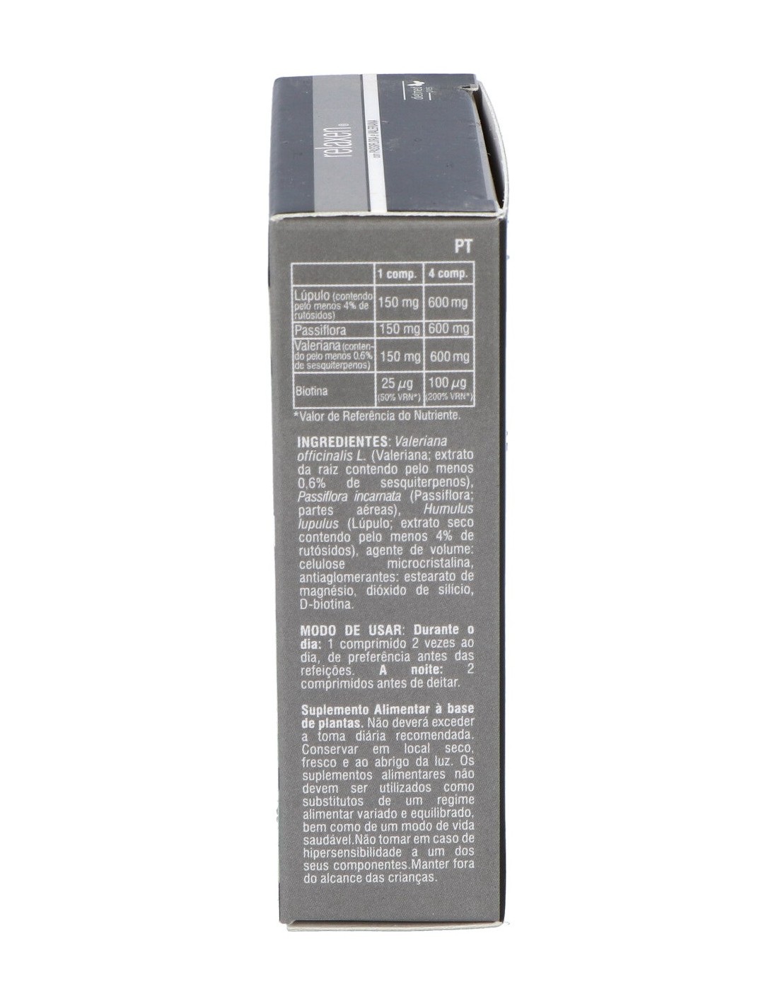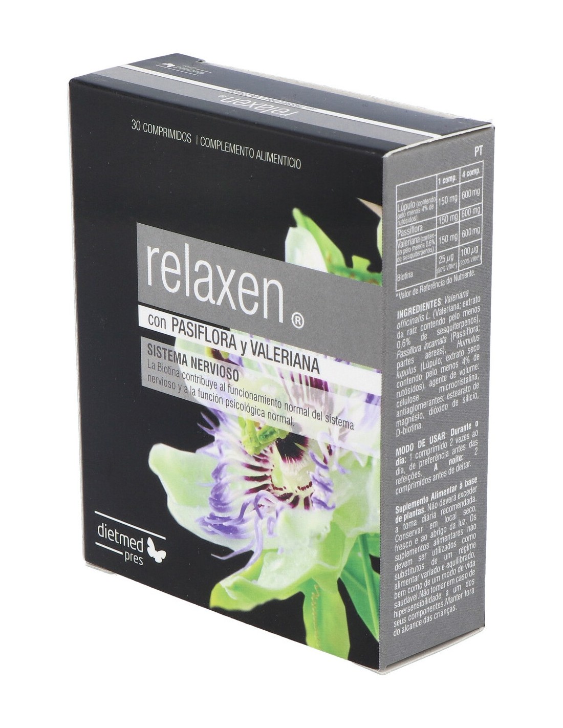 Valeriana officinalis L. (Valeriana: extracto de la raíz conteniendo al menos 0,6% de sesquiterpenos), Passiflora incarnata (Pasiflora: partes aéreas), Humulus lupulus (Lúpulo: extracto seco conteniendo al menos 4% de rutósidos), Agente de carga: celulosa microcristalina, Antiaglomerantes: estearato de magnesio, Dióxido de silicio, D-biotina.