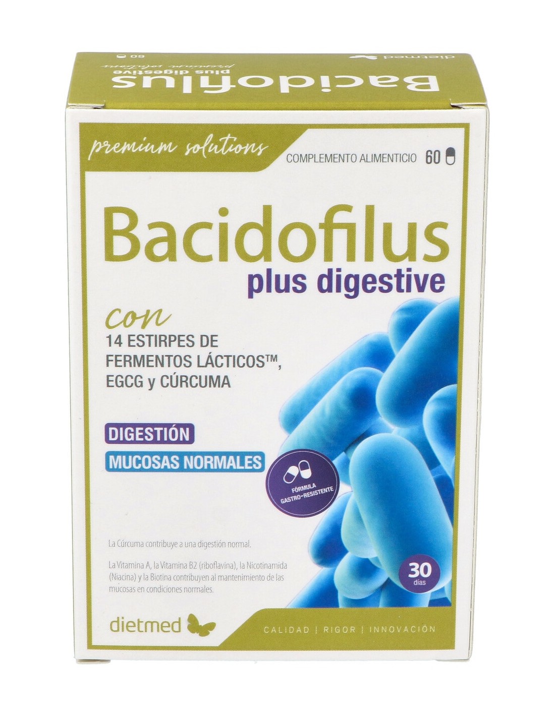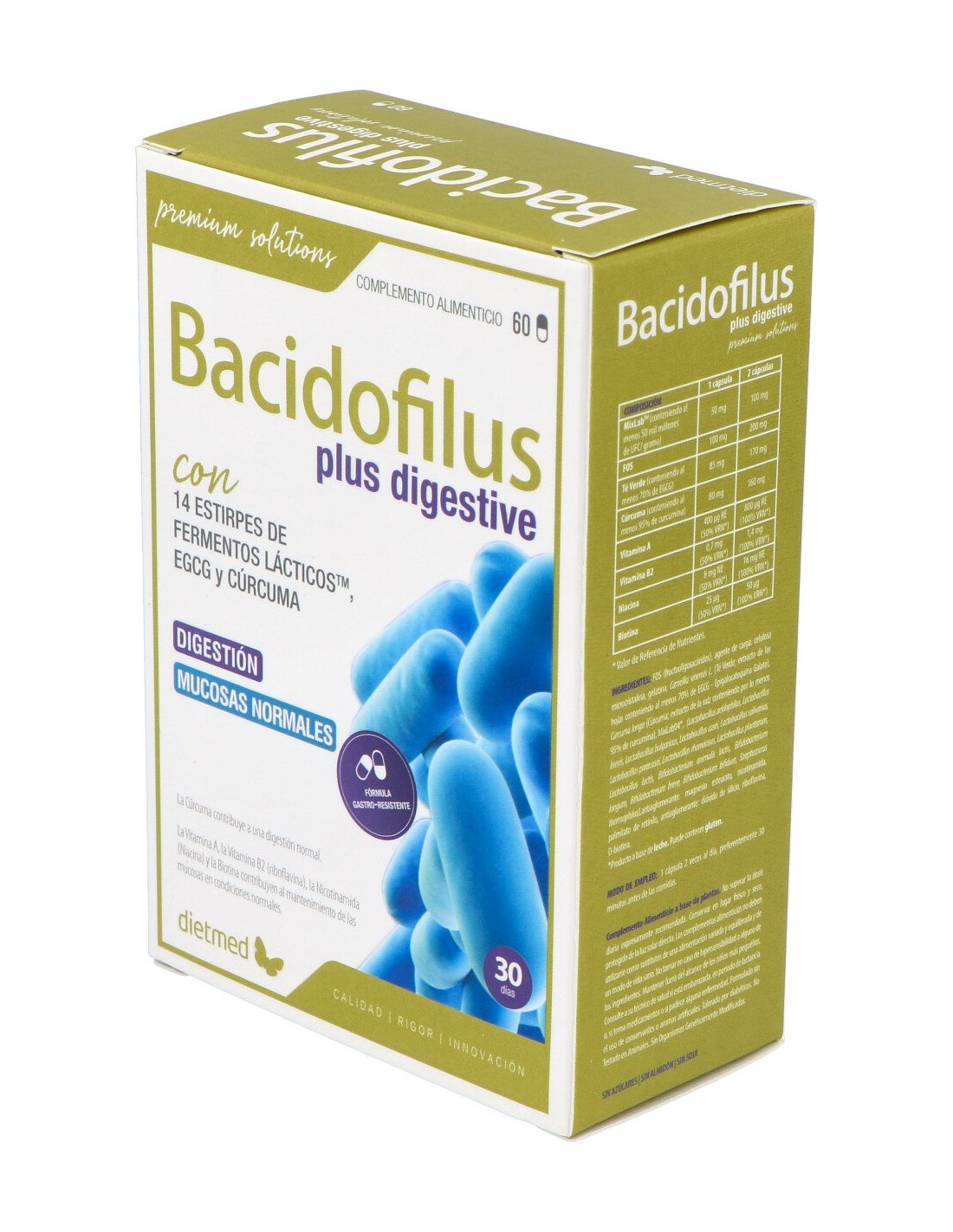 MixLab04 (Lactobacillus acidophilus, Lactobacillus brevis, Lactobacillus bulgaricus, Lactobacillus casei, Lactobacillus salivarius, Lactobacillus paracasei, Lactobacillus rhamnosus, Lactobacillus plantarum, Lactobacillus lactis, Bifidobacterium animalis lactis, Bifidobacterium longum, Bifidobacterium breve, Bifidobacterium bifidum, Streptococcus thermophilus) conteniendo al menos 5x1010 UFC 100 mg, FOS 200 mg, Té Verde (conteniendo al menos 70% de EGCG) 170 mg, Cúrcuma (conteniendo al menos 95% de curcumina) 160 mg, Vitamina A 800 µg RE (100% VRN*), Vitamina B2 1,4 mg (100% VRN*), Niacina 16 mg NE (100% VRN*), Biotina 50 µg (100% VRN*).