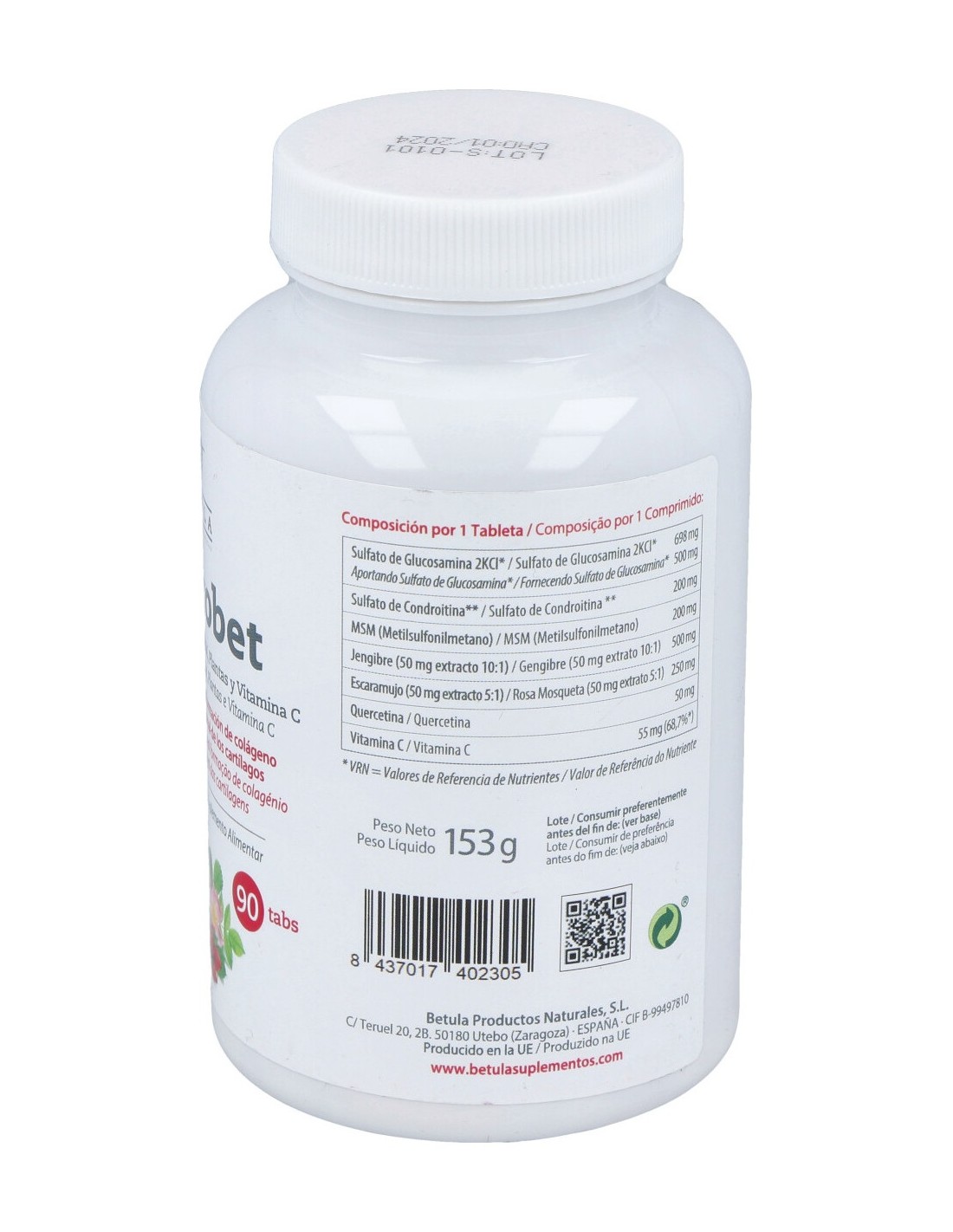 Sulfato de Glucosamina 2KCl, Sulfato de Condroitina, Metilsulfonilmetano (MSM), Agentes de Carga (Celulosa, Fosfato Cálcico), Quercetina, Extracto de Jengibre (Zingiber officinale), Extracto de Escaramujo (Rosa canina), Agente de Recubrimiento (Hipromelosa, Glicerina, Hidroxipropilmetilcelulosa), Vitamina C (Ácido L-Ascórbico), Antiaglomerante (Estearato de Magnesio).