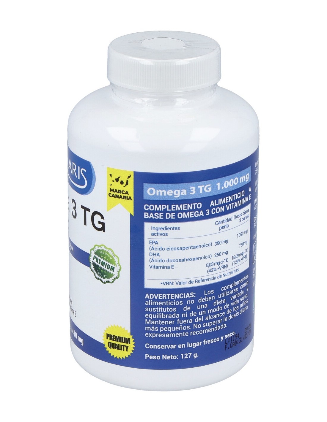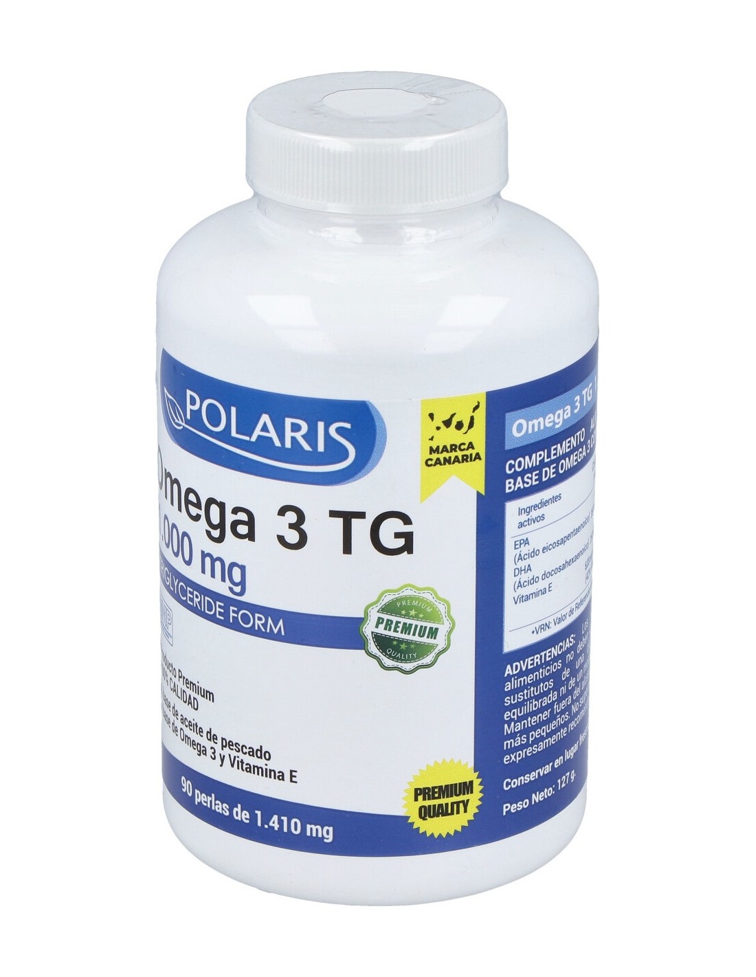 Aceite de pescado 18EPA/12DHA, agente de recubrimiento (gelatina y glicerina). Indicaciones: Complemento alimenticio a base de aceite de pescado rico en ácidos grasos poliinsaturados.