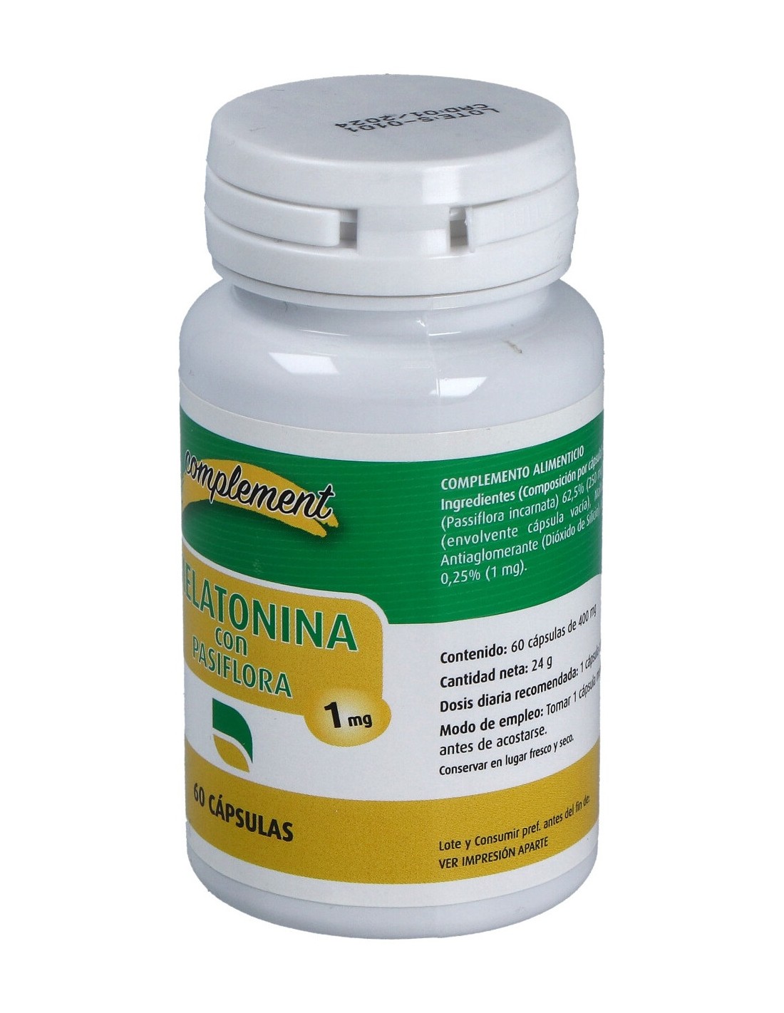 Por 1 cápsula: Pasiflora 250 mg, gelatina (envolvente cápsula vacía), maltodextrina, dióxido de silicio, melatonina 1 mg.