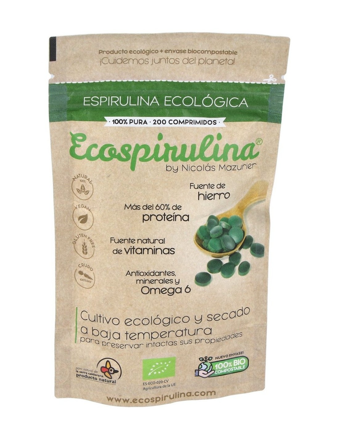 Espirulina producida en el Parque Natural de la Serra Calderona (Valencia, España) con agua de manantial. Fuente de energía y bienestar, fortalece y aumenta la resistencia. Ideal para una vida cotidiana activa, para toda la familia.