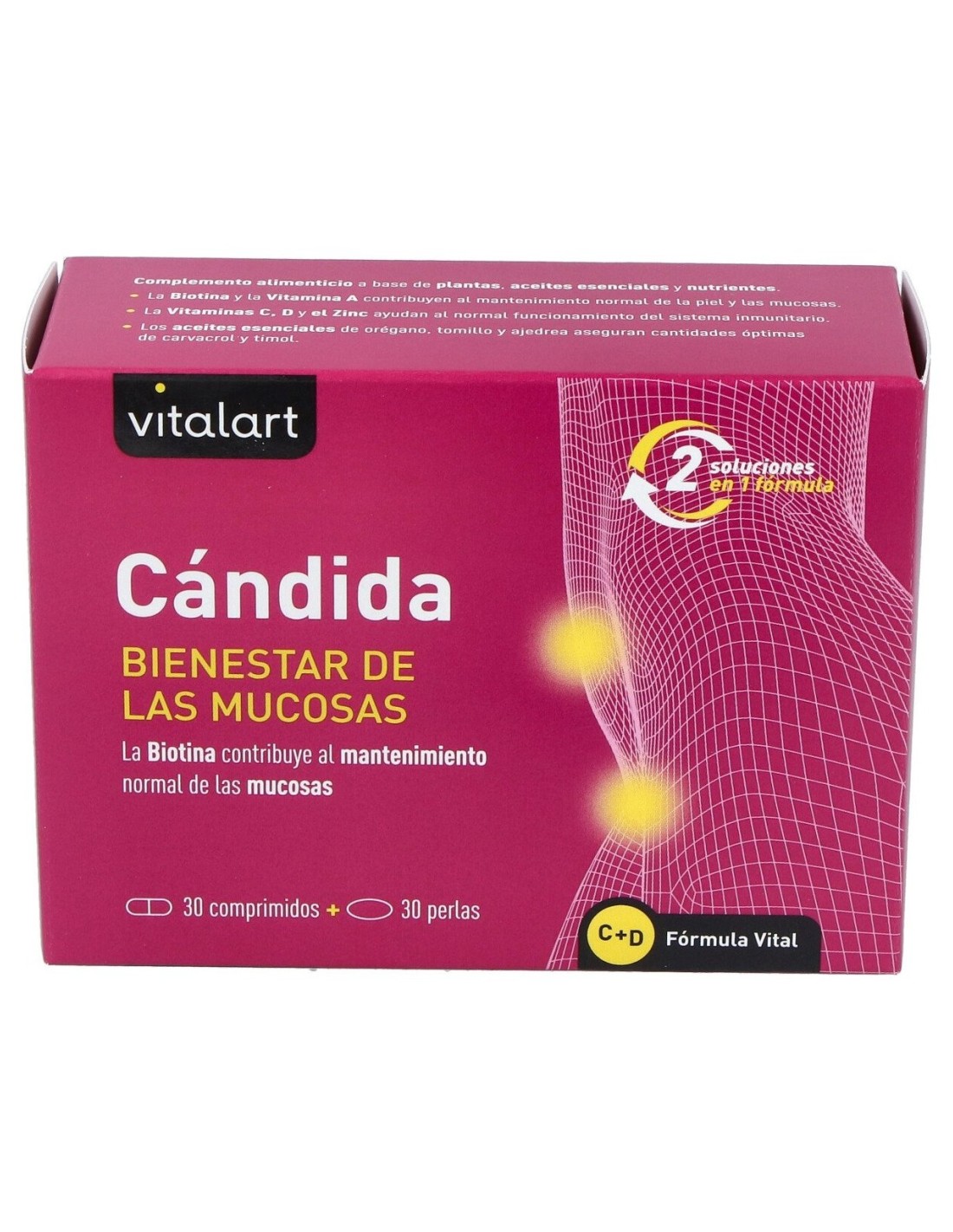 Combina una fórmula en perlas con recubrimiento entérico a base de aceites esenciales quimiotipados (orégano, tomillo y ajedrea) y una fórmula en comprimidos a base de plantas y nutrientes específicos, de acción inmunomoduladora. Estos nutrientes y otros como la biotina y la vitamina A sirven de apoyo al mantenimiento de las mucosas en condiciones normales.