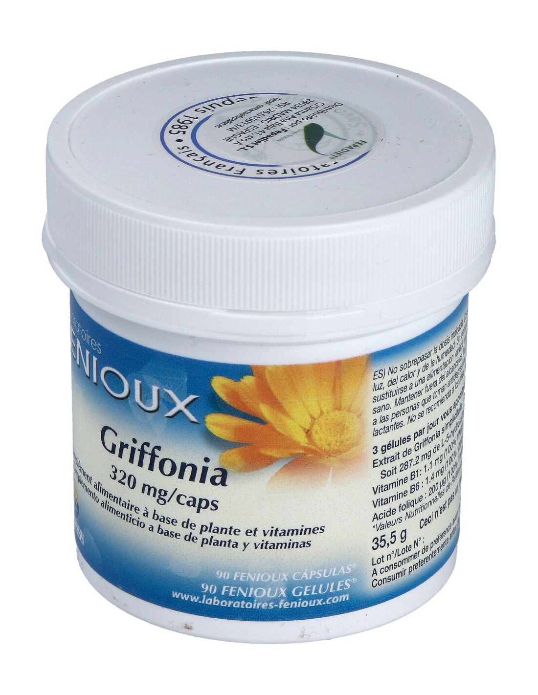 Griffonia simplicifolia (Griffonia simplicifolia) 30% L-5-HTP Cápsula, Gelatina (gelatina), Vitamina B6, Vitamina B1, Ácido Fólico.