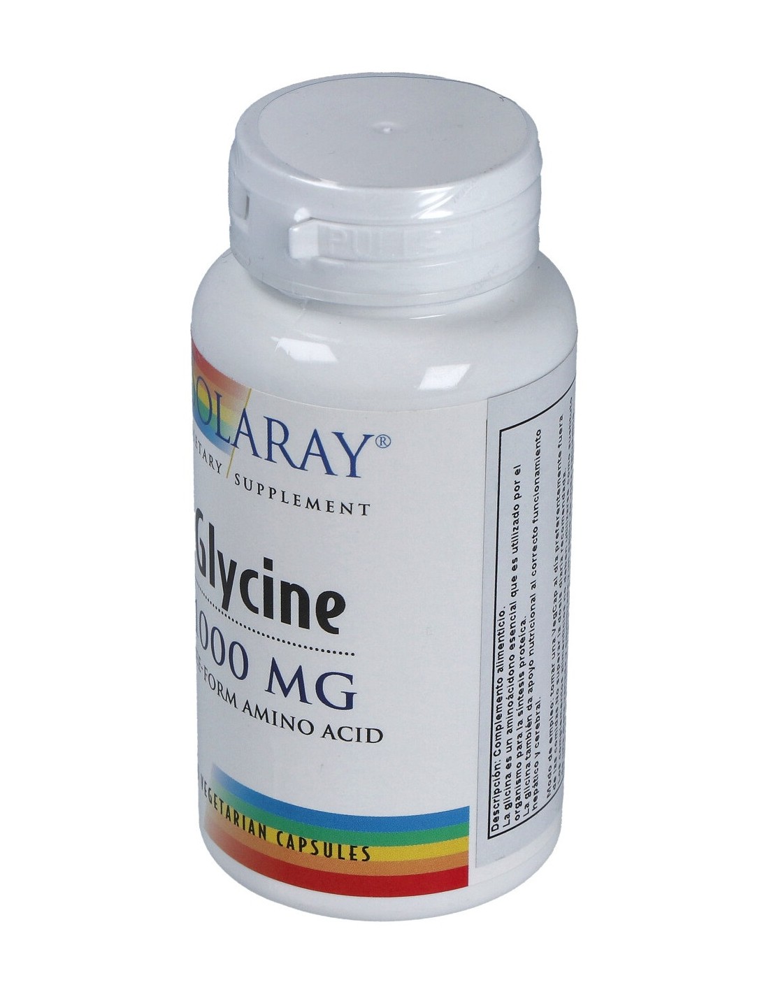 Glicina (forma libre de aminoácido), cápsula de celulosa vegetal: antiaglomerante: estearato de magnesio y sílice.