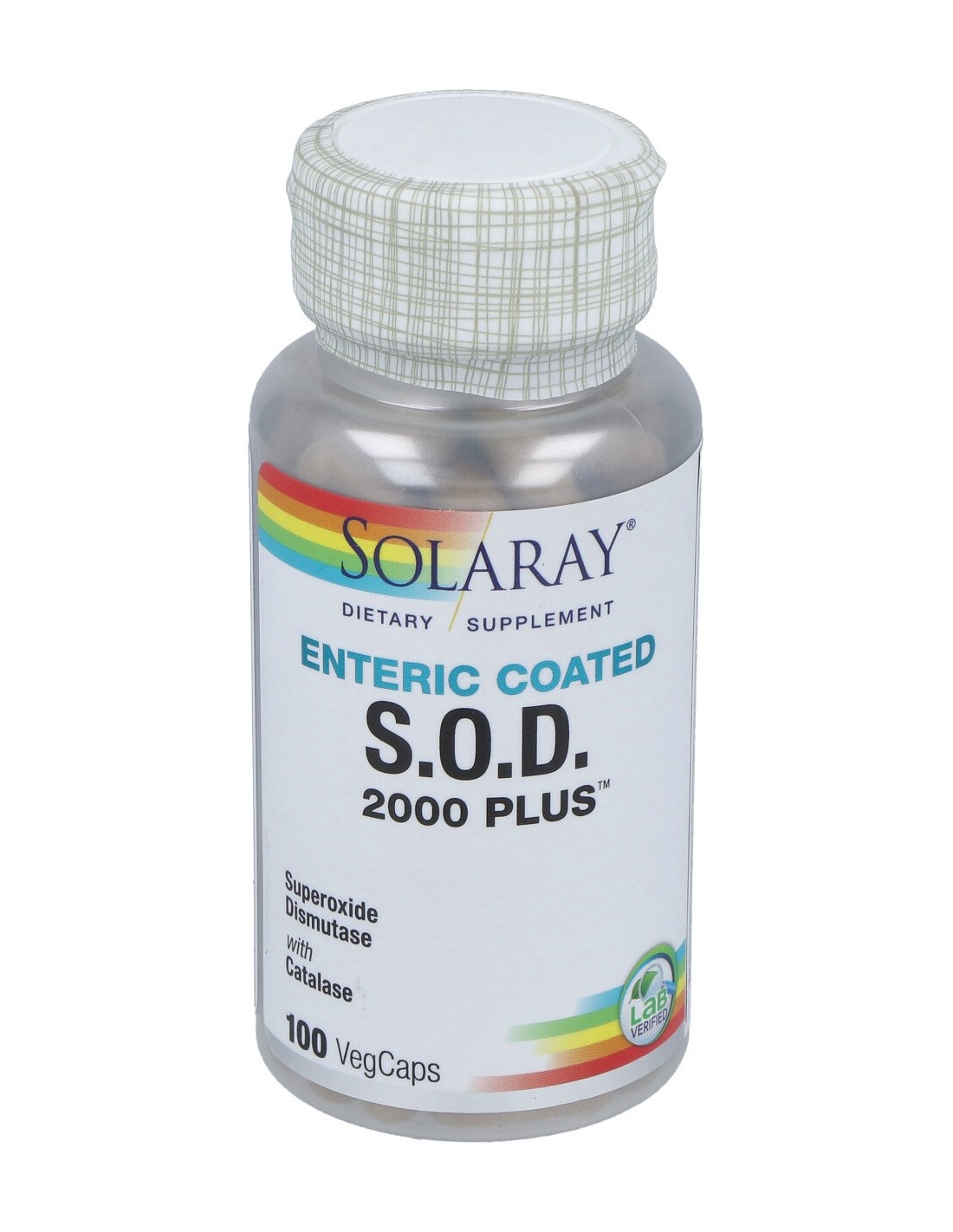 S.O.D complex: superóxido dismutasa (2.000 unidades McCord Fridovich, que aporta de forma natural glutation peroxidasas), catalasa, maltodextrina, cápsula de celulosa vegetal, agente de carga: celulosa.