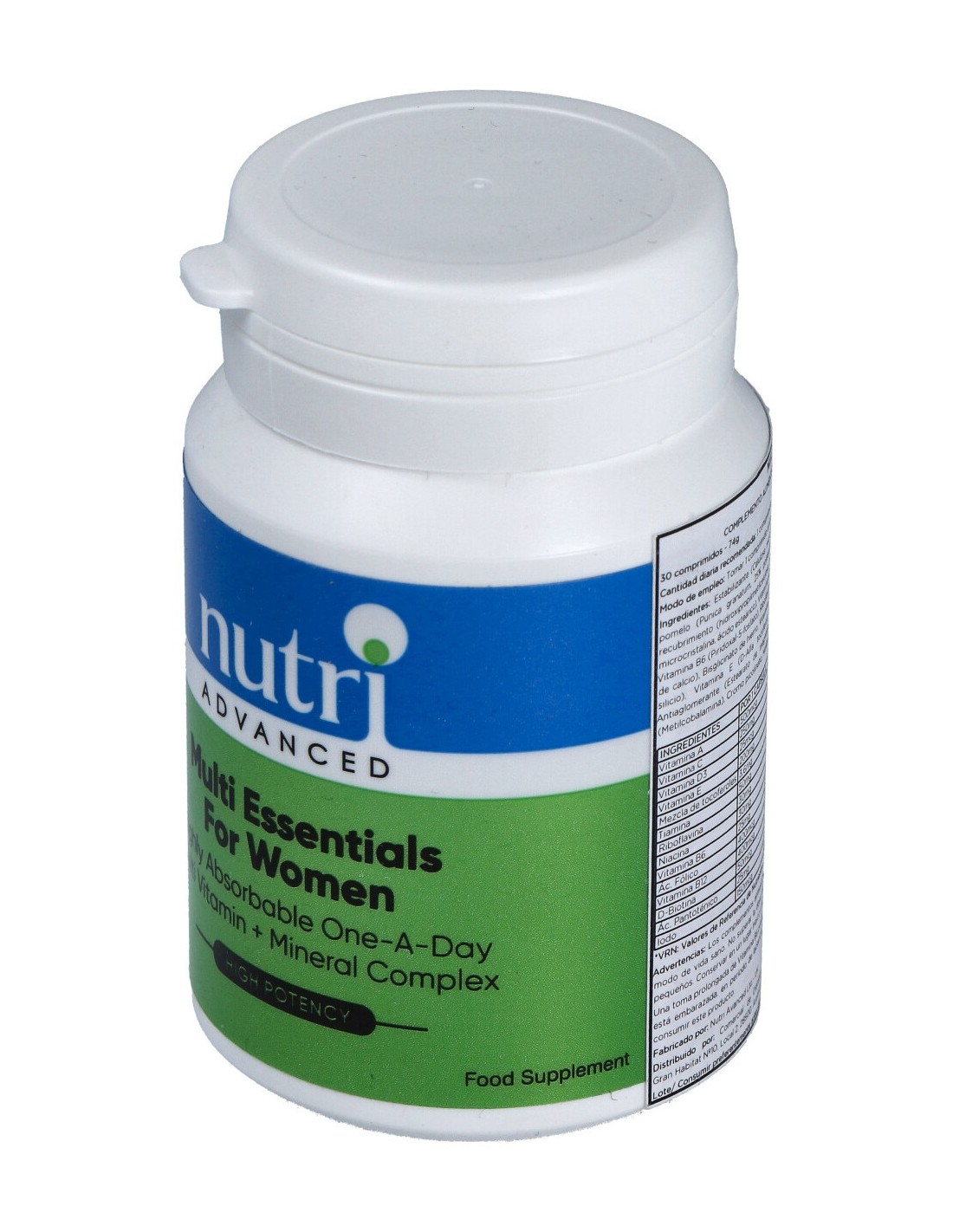 Vitamina A (betacaroteno) (5000IU) 1500 µg, Vitamina C (ácido ascórbico) 250 mg, Calcio (carbonato, pantotenato, citrato-malato) 11,5 mg, Vitamina D3 (colcalciferol)(1000IU) 25 µg, Vitamina E (tocoferoles mixtos) 200 mg -de los cuales: alfa tocoferol 70 IU-, Vitamina B1 (tiamina HCl) 50 mg, Vitamina B2 (riboflavina) 30 mg, Vitamina B3 (niacinamida) 30 mg, Vitamina B6 (piridoxina HCl) 50 mg, Folato (ácido fólico) 400 µg, Vitamina B12 (cianocobalamina) 400 µg, Biotina 50 µg, Ácido pantoténico (pantotenato cálcico) 25 mg, Yodo (de yoduro potásico / kelp) 200 µg, Magnesio (citrato) 25 mg, Zinc (óxido, citrato) 20 mg, Selenio (seleniometionina) 55 µg, Cobre (aspartato) 6 µg, Manganeso (citrato) 18 µg, Cromo (picolinato) 50 µg, Molibdeno (molibdato de sodio) 100 µg, Colina (bitartrato) 20 mg, Potasio (citrato) 10 mg, Vitamina K2 (metaquinona) 90 µg, Boro (borato sódico) 1000 µg, Extracto de fruto de granada (Punica granatum) (estandarizado al 40% de ácido elágico) 100 mg, Brócoli en polvo (Brassica olearaceae) 100 mg, DIM/Diindolilmetano 12 mg, celulosa microcristalina, ácido esteárico, goma celulosa, estearato de magnesio, dióxido de silicio, recubrimiento (hipomellosa, polidextrosa, polvo de remolacha, dióxido de titanio, silicato de magnesio, maltodextrina, triglicéridos de cadena media).