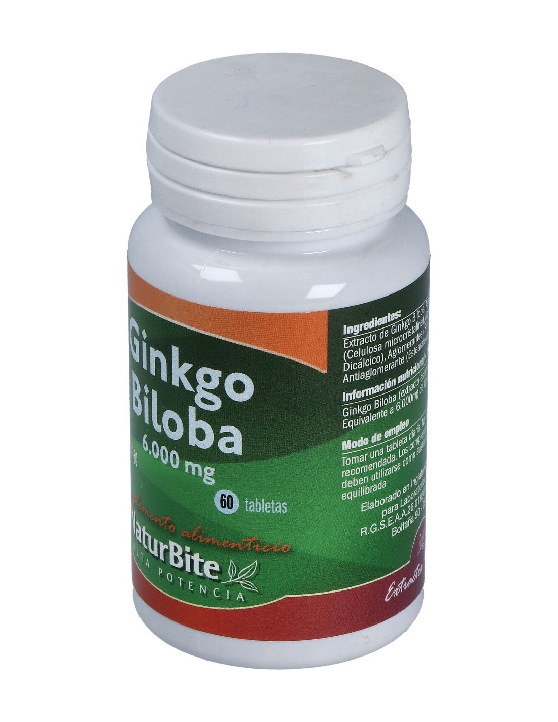 Ginkgo Biloba (Aportando 120mg. Extracto 50:1) 6000mg. Fosfato Dicálcico, Celulosa Microcristalina, Dióxido De Silicio, Ácido Esteárico, Estearato De Magnesio.