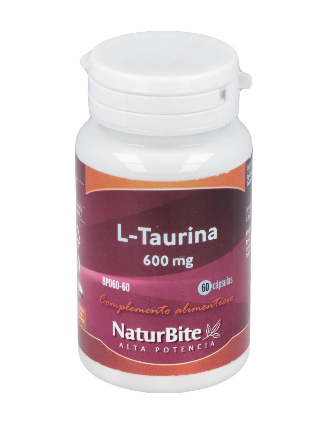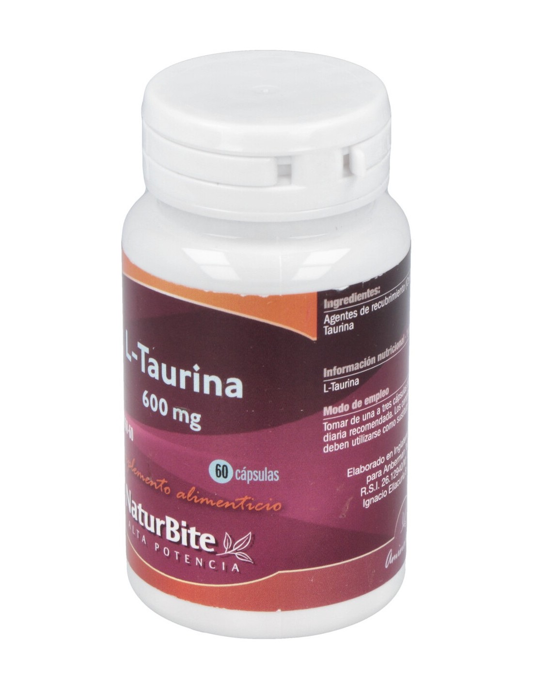 L-Taurina 600 mg. Celulosa microcristalina, Cápsula tamaño 00 blanco (colorante dióxido de titanio)