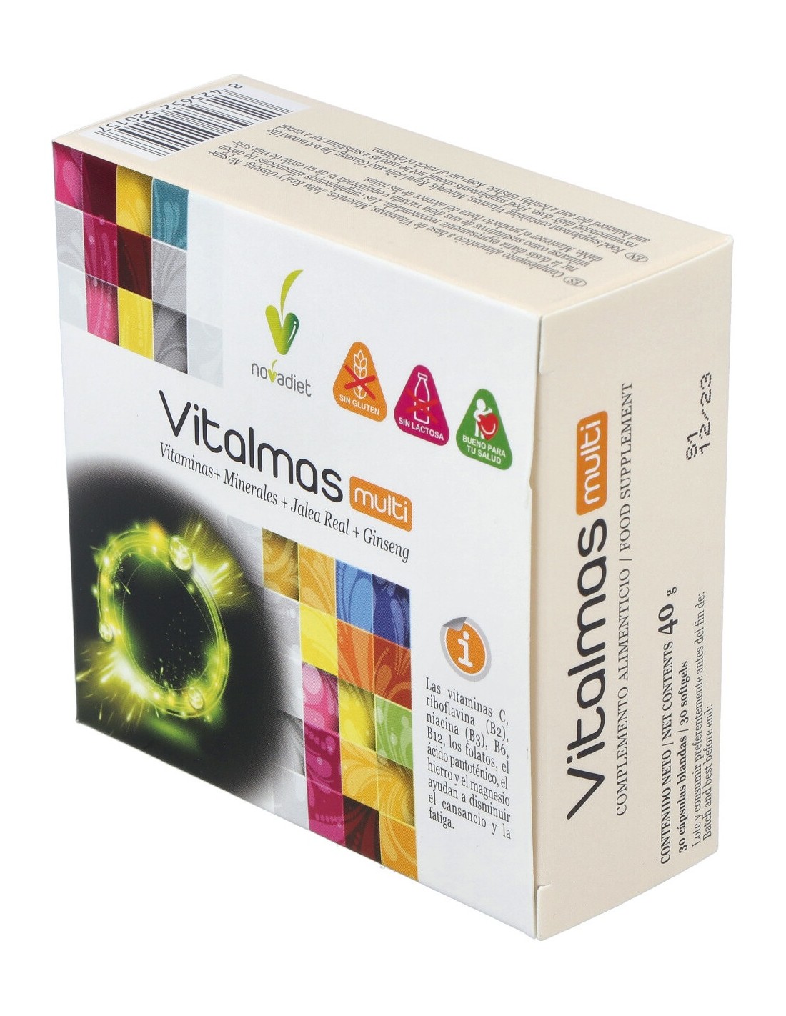 Agente de carga (aceite de girasol), Óxido de magnesio, Vitamina C (ácido L ascórbico), Fosfato de cálcio, Sulfato ferroso, Sulfato de zinc, Emulgentes (glicerol monoestearato, lecitina de soja IP*), Jalea real liofilizada, Extracto de ginseng coreano, Nicotinamida, Vitamina E (D-alfa-tocoferol), D-pantotenato cálcico, Sulfato de manganeso, Sulfato cúprico, Vitaminas A (palmitato de retinilo), B6 (clorhidrato de piridoxina), B2 (riboflavina), B1 (mononitrato de tiamina), B12 (cianocobalamina), Molibdato de sodio, Ácido fólico, Vitamina D (colecalciferol), Yoduro de potasio, D-biotina, Selenito de sodio. Cubierta: Agua, Gelatina, Glicerina, Colorantes (óxido de hierro negro, dióxido de titanio, Patent blue).