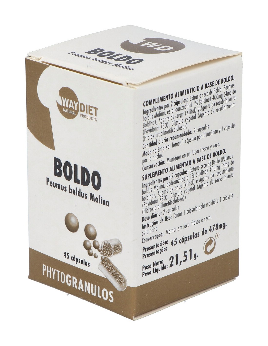 Boldo (Peumus boldus Molina) 400 mg, Agente de carga (Xilitol), Agente de recubrimiento (Povidona K30). Cápsula vegetal.