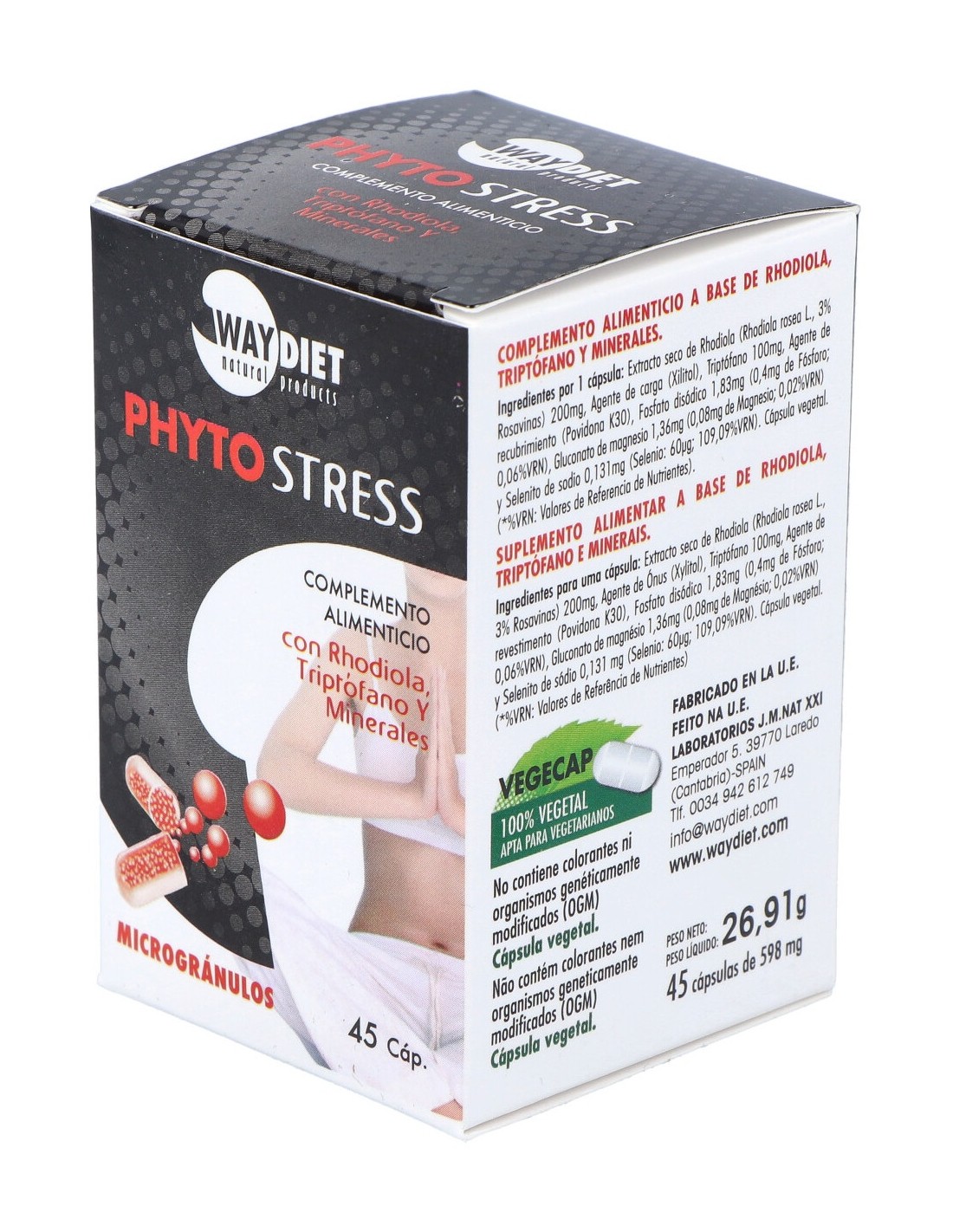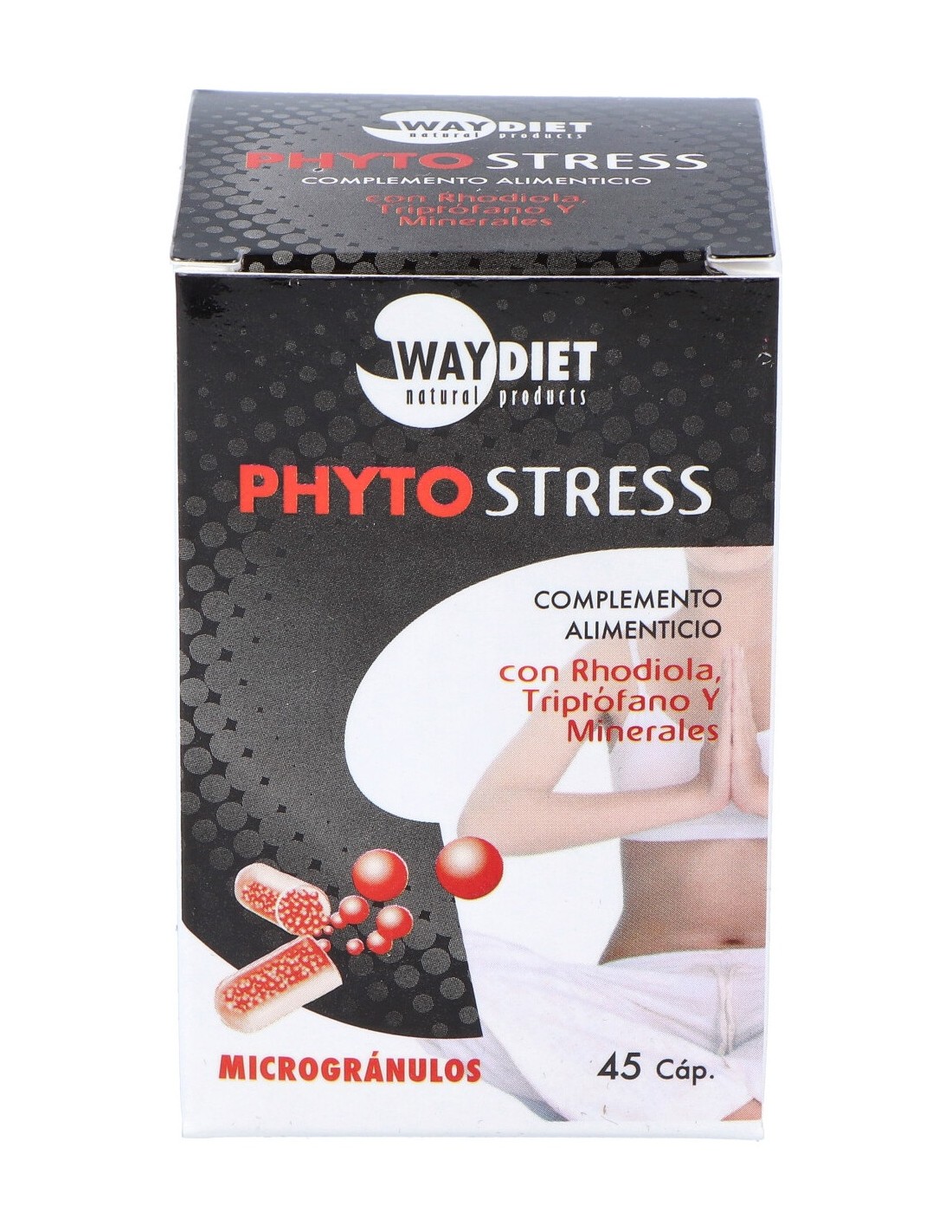 Complemento alimenticio formulado con ingredientes que ayudan a aumentar la respuesta del organismo frente a situaciones de estrés. Entre los ingredientes de Way Diet Phytostress, se encuentra: Rhodiola rosea, Triptófano, Selenio, Fósforo y Magnesio.