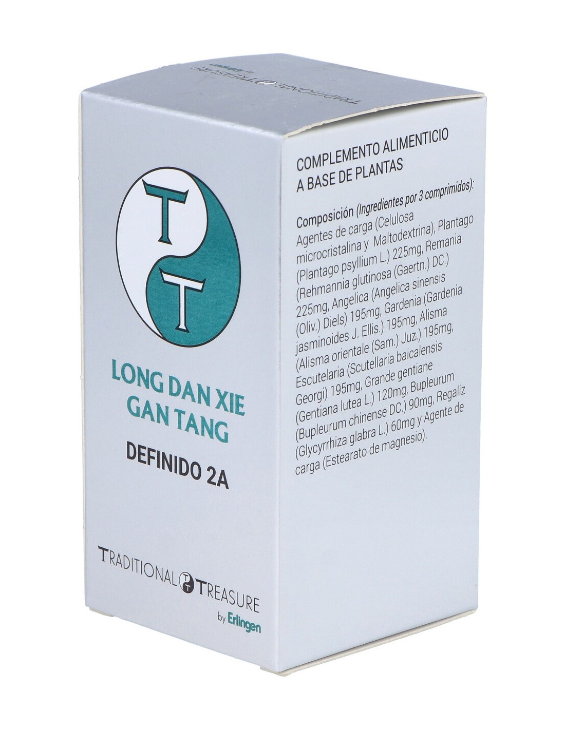 Agentes de carga (Celulosa microcristalina y Maltodextrina), Plantago (Plantago psyllium L.) 225 mg, Remania (Rehmannia glutinosa (Gaertn.) DC.) 225 mg, Angelica (Angelica sinensis (Oliv.) Diels) 195 mg, Gardenia (Gardenia jasminoides J. Ellis.) 195 mg, Alisma (Alisma orientale (Sam.) Juz.) 195 mg, Escutelaria (Scutellaria baicalensis Georgi) 195 mg, Genciana (Gentiana lutea L.) 120 mg, Bupleurum (Bupleurum chinense DC.) 90 mg, Regaliz (Glycyrrhiza glabra L.) 60 mg y Agente de carga (Estearato de magnesio).
