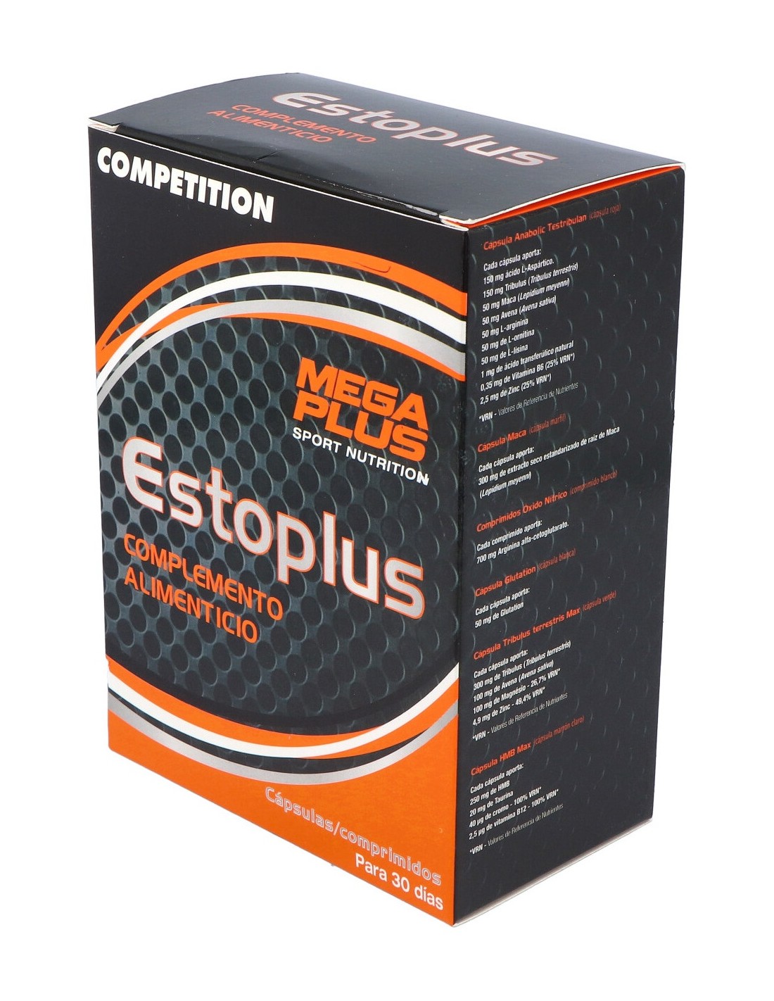 Ingredientes: ácido L-aspártico, tribulus terrestris (tribulus), cápsula [gelatina comestible, colorante (dióxido de titanio)], estabilizador (celulosa microcristalina), Lepidium meyenni (maca), avena sativa (avena), L-arginina, L-ornitina, L-lisina, emulgente (sales magnésicas de ácidos grasos), sulfato de cinc, antiaglomerante (dióxido de silicio), ácido trans-ferúlico natural, clorhidrato de piridoxina (vitamina B6).