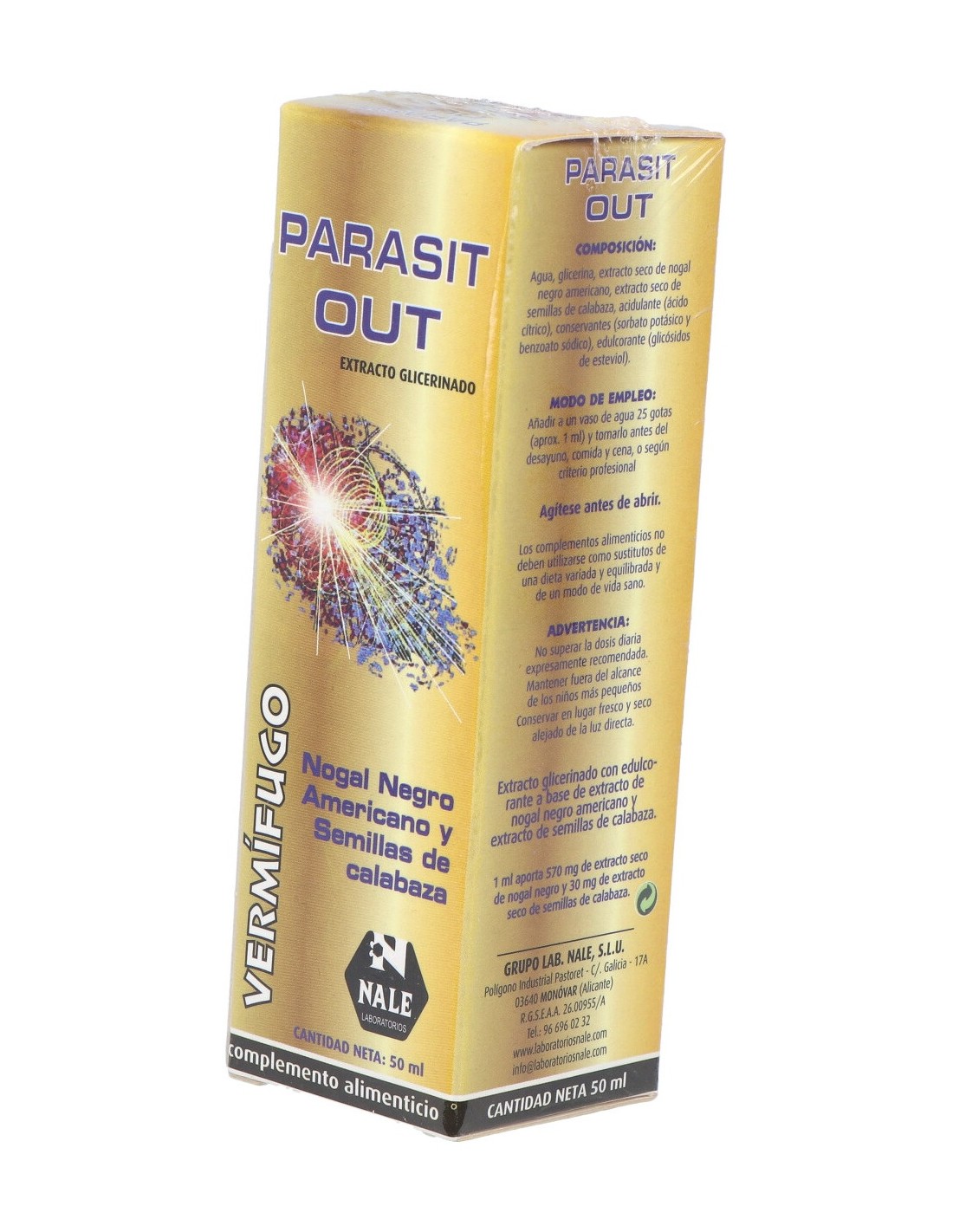 Ayuda contra todo tipo de parásitos intestinales, ayuda a tratar el acné, asma, pie de atleta, llagas, herbes labial, caspa, diarrea, disentería, fiebre, hemorroides, infecciones internas, congestión hepática, malaria, sífilis, úlceras.PARASIT OUT 50ml. de NALE está disponible en nuestra web.