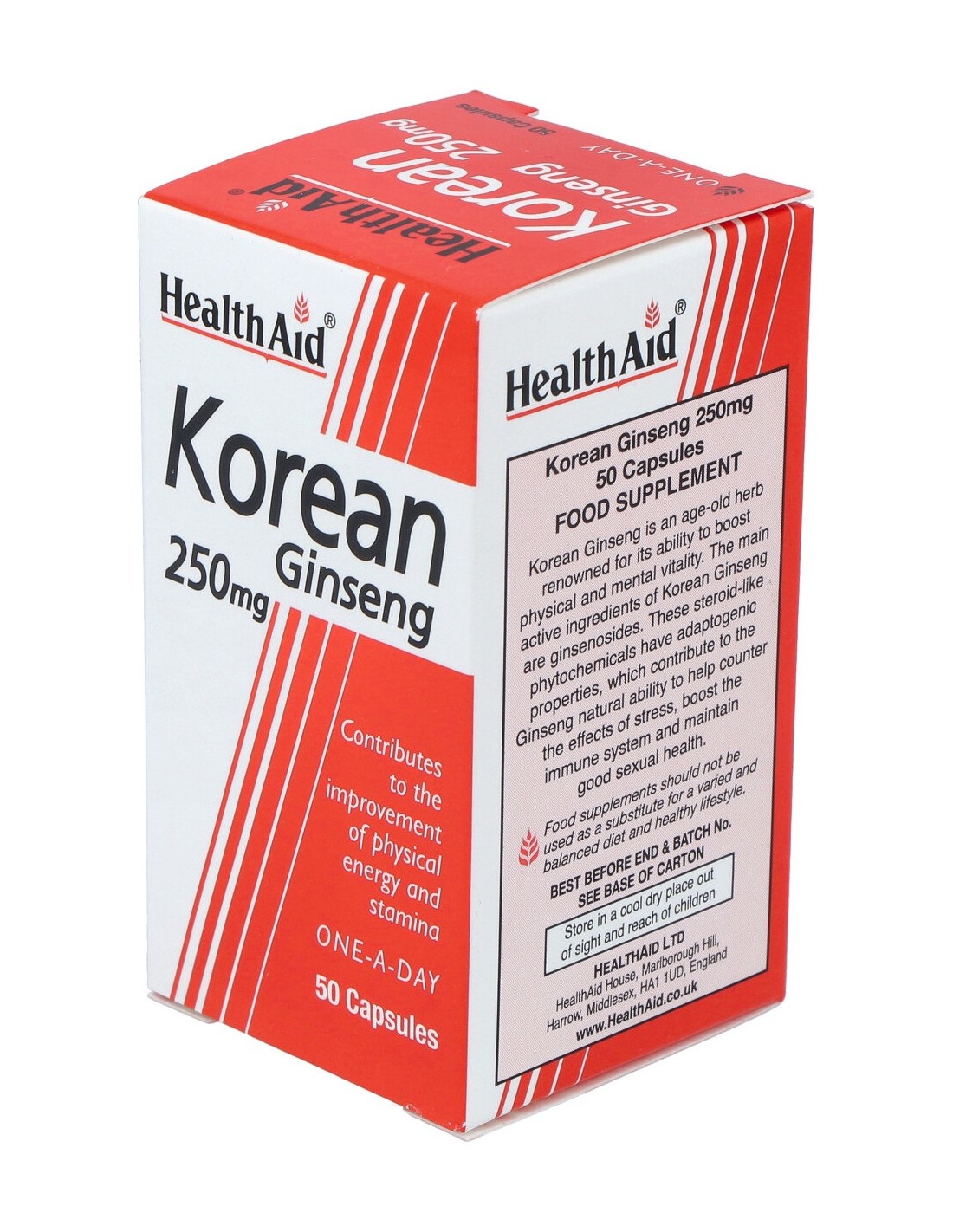 Complemento alimenticio elaborado a base de extracto de Ginseng coreano, Panax ginseng. El ginseng es la hierba más famosa de Oriente y es utilizado en todo el mundo para dar más resistencia, vigor y vitalidad. Todos los productos herbarios de HealthAid están formulados utilizando extractos y polvos de plantas de la mejor calidad; las plantas, de recolección silvestre o cultivadas orgánicamente, son meticulosamente procesadas para mantener su pureza y elevada potencia.