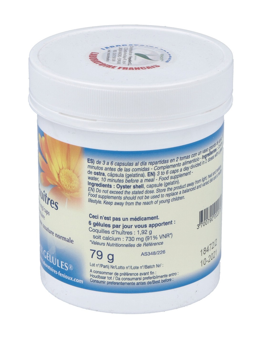 Complemento alimenticio elaborado a base de polvo de conchas marinas aportando grandes cantidades de calcio. Contribuye a mantener el sistema muscular y óseo en buena salud. El polvo de concha de ostra proviene de las ostras de Bretaña, que se recolectan en un lugar libre de contaminación, con baja densidad de población. Es buena fuente de oligoelementos y minerales.