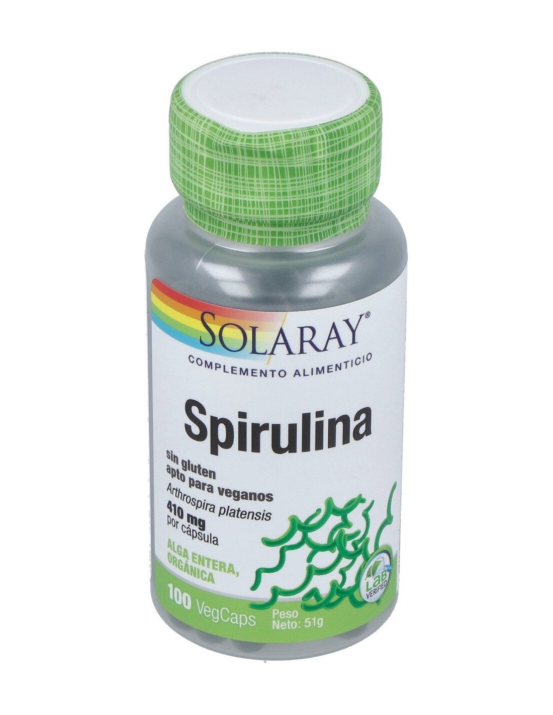 Complemento alimenticio Solaray Spirulina. El envase posee un peso de 410mg y contiene 100 unidades. Su composición a base de espirulina le confiere propiedades vitamínicas beneficiosas para el organismo. Aporta la dosis de minerales esenciales para contribuir al desempeño adecuado de las funciones orgánicas. Brinda cantidades importantes de vitamina A que contribuyen al metabolismo adecuado del hierro, al funcionamiento óptimo del sistema inmunitario y al proceso de diferenciación celular. Recomendado para pacientes con deficiencia vitamínica general. Adecuado para usuarios bajo régimen dietético a base de alimentos orgánicos.