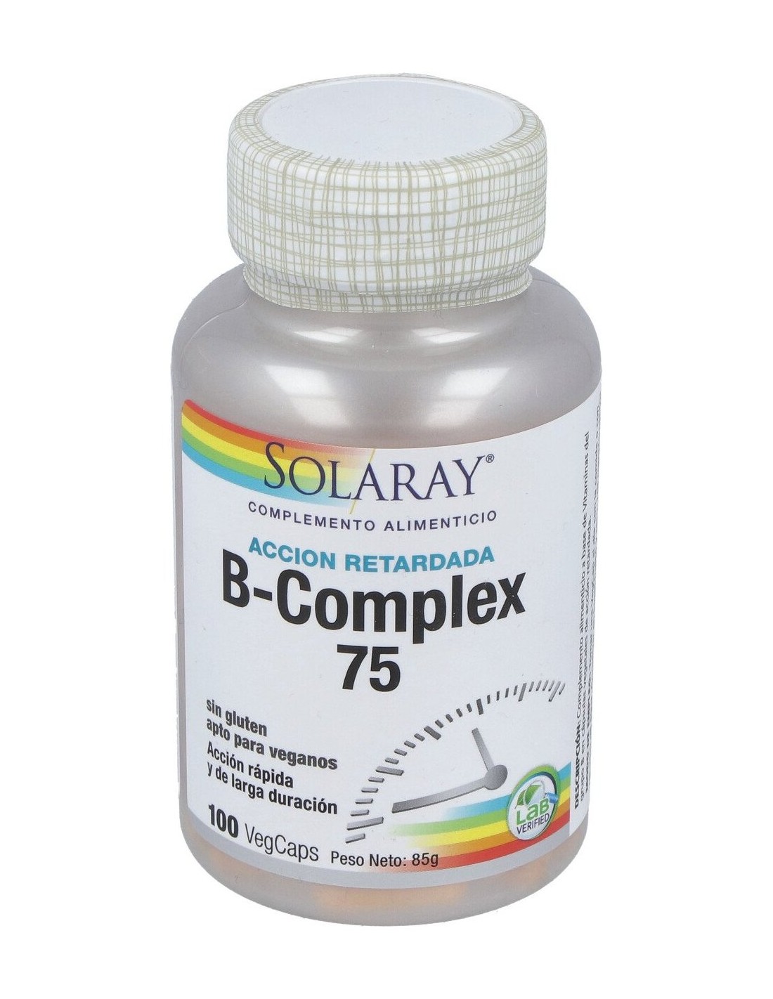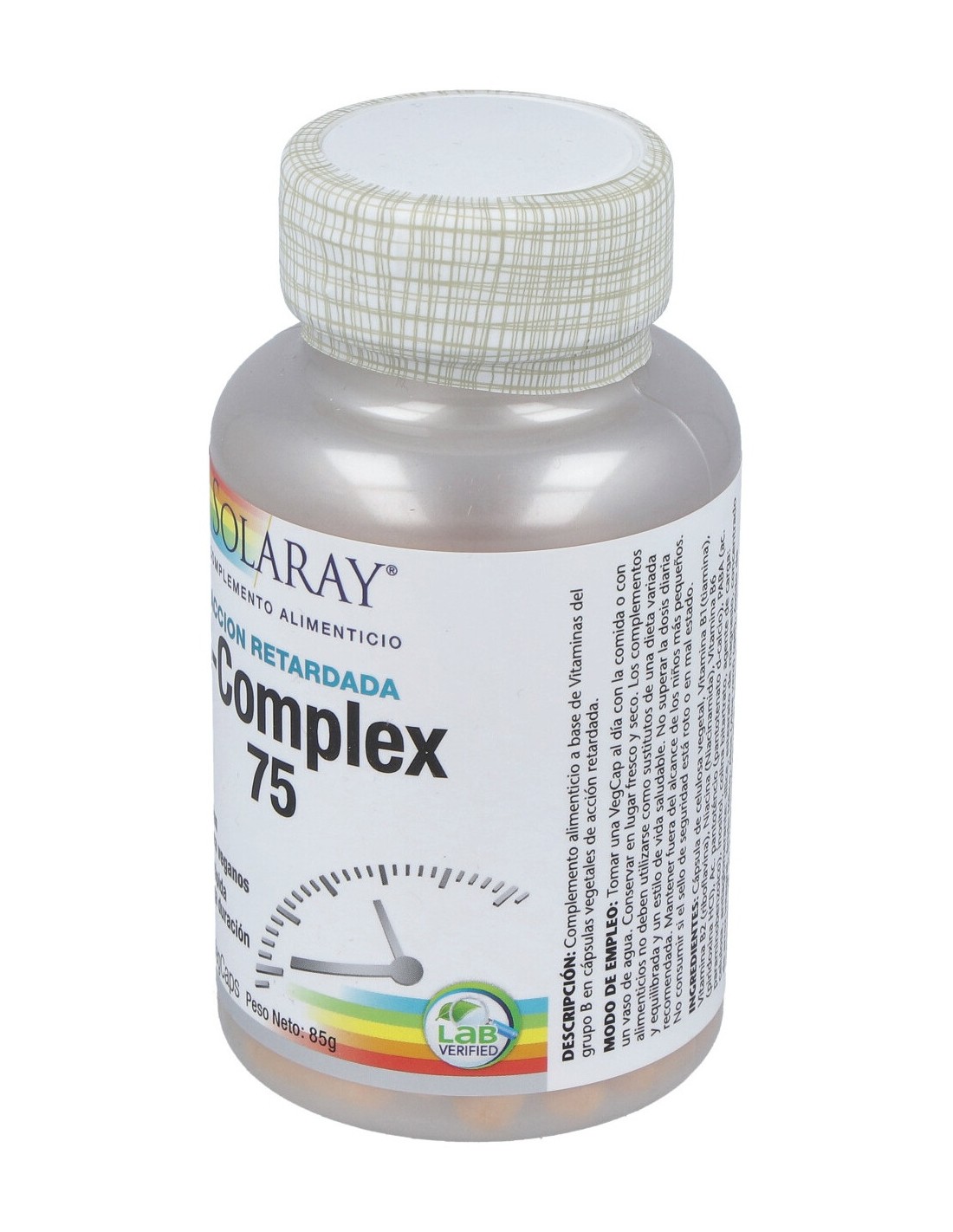 Cápsula de celulosa vegetal, vitamina B1 (tiamina), vitamina B2 (riboflavina), niacina (niacinamida), vitamina B6 (piridoxina HCI), ácido pantoténcio (pantotenato cálcico), PABA (ácido paraminobenzoico), colina (colina bitartrato), inositol, base de alimentos enteros: concentrado de arroz integral, gel de aloe vera: agente de carga: celulosa: antiaglomerante:sílice, estearato de magnesio, ácido esteárico, óxido de magnesio, ácido fólico, vitamina B12 (cianocobalamina), biotina.