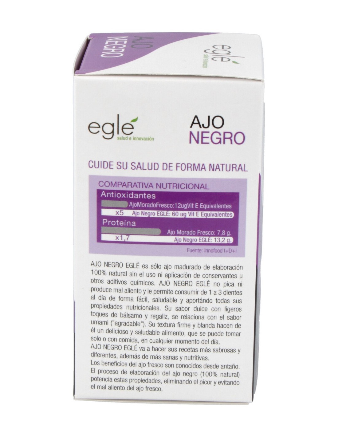 Producto 100% natural de agradable sabor. Al ajo negro se le atribuye una actividad antioxidante 5 veces mayor que la del ajo en su estado fresco, y el contenido enpolifenoles es de 5 a 7 veces superior.