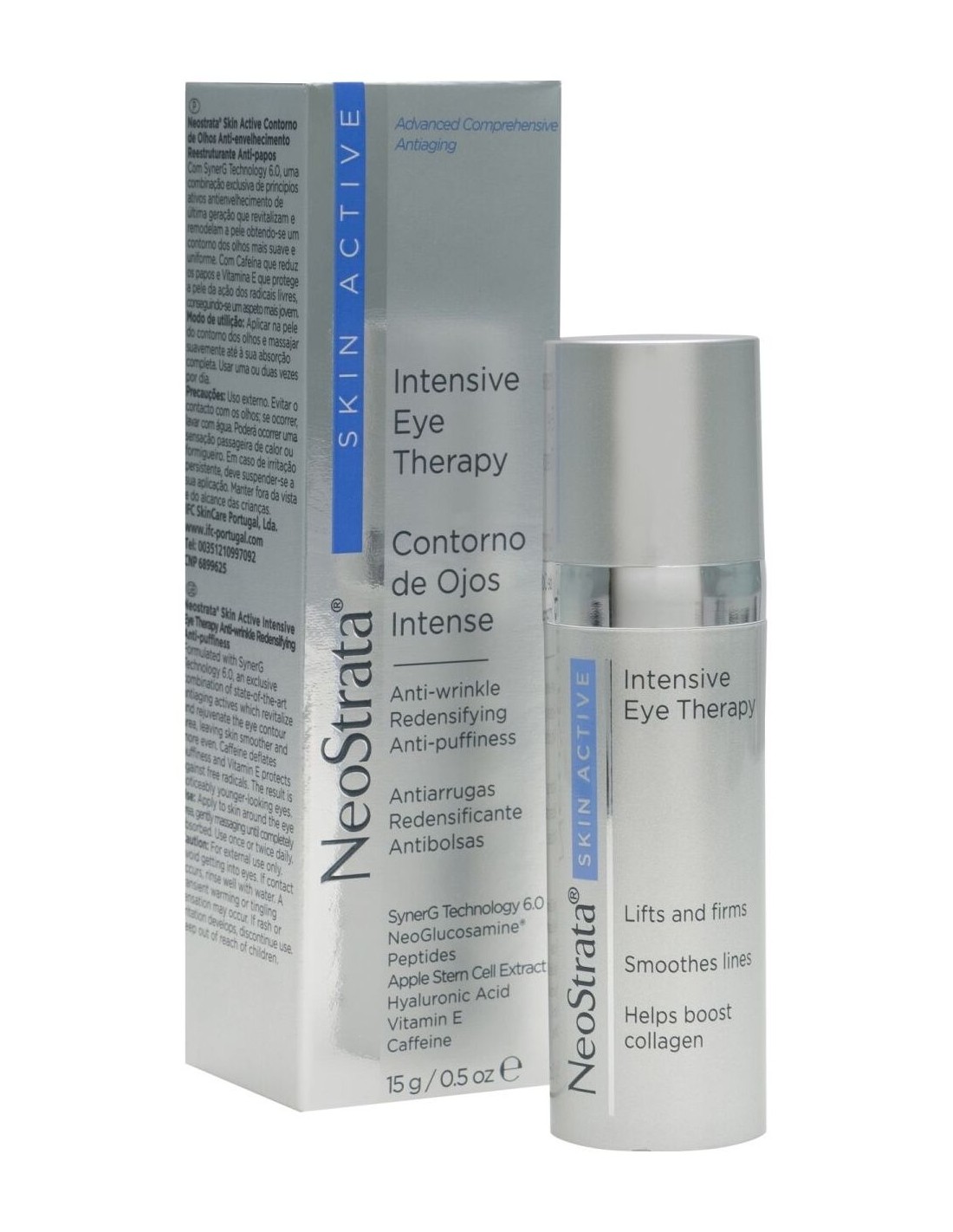 Con SynerG Technology 6.0, que combina exclusivos activos antiedad de última generación (NeoGlucosamina y péptidos) para obtener una piel del contorno de ojos más lisa y uniforme. Incluye un extracto de células madre de manzana que contribuye a aumentar la longevidad de las células esenciales de la piel, cafeína que reduce las bolsas y vitamina E que protege la piel frente a los radicales libres, consiguiendo una mirada más joven.