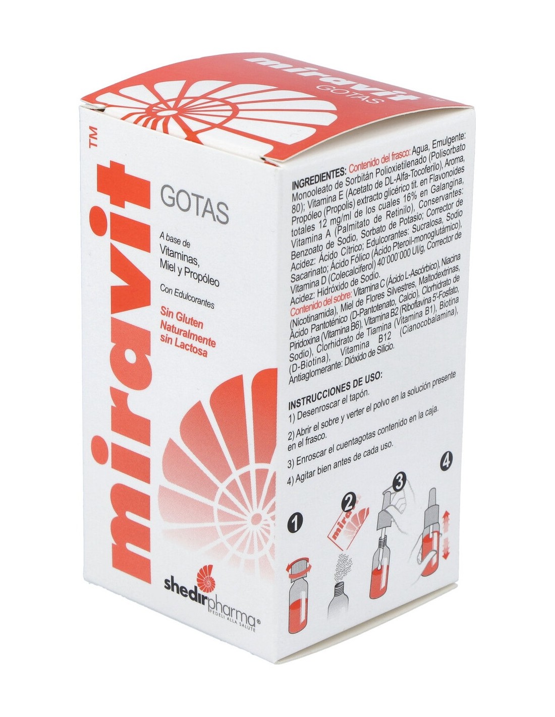 Agua, Emulgente: Polisorbato 80. Vitamina C (Ácido L-Ascórbico), Miel de flores Silvestres, Niacina (Nicotinamida), Vitamina E (Acetato de DL-alfa-tocoferilo), Ácido Pantoténico (D-Pantotenato Cálcico). Aroma. Vitamina B6 (Clorhidrato de Piridoxina), Vitamina B2 (Riboflavina 5´-fosfato Sódico), extracto glicérico de Propolis (Propóleos) Tit. en flavonoides 12 mgs/mls de los cuales 16% en Galangin, Vitamina B1 (Clorhidrato de Tiamina), Vitamina A (Palmitato de Retinilo) 1MUI/g. Conservantes: Benzoato de Potasio, Sorbato de Potasio. Corrector de Acidez: Ácido Cítrico. Edulcorante: Sucralosa. Biotina. Edulcorante: Sodio Sacárinato. Ácido Fólico, Vitamina D (Colecalciferol) 40.000.000 U.I./g, Vitamina B12 (Cianocobalamina). Corrector de acidez: Hidróxido de Sodio.