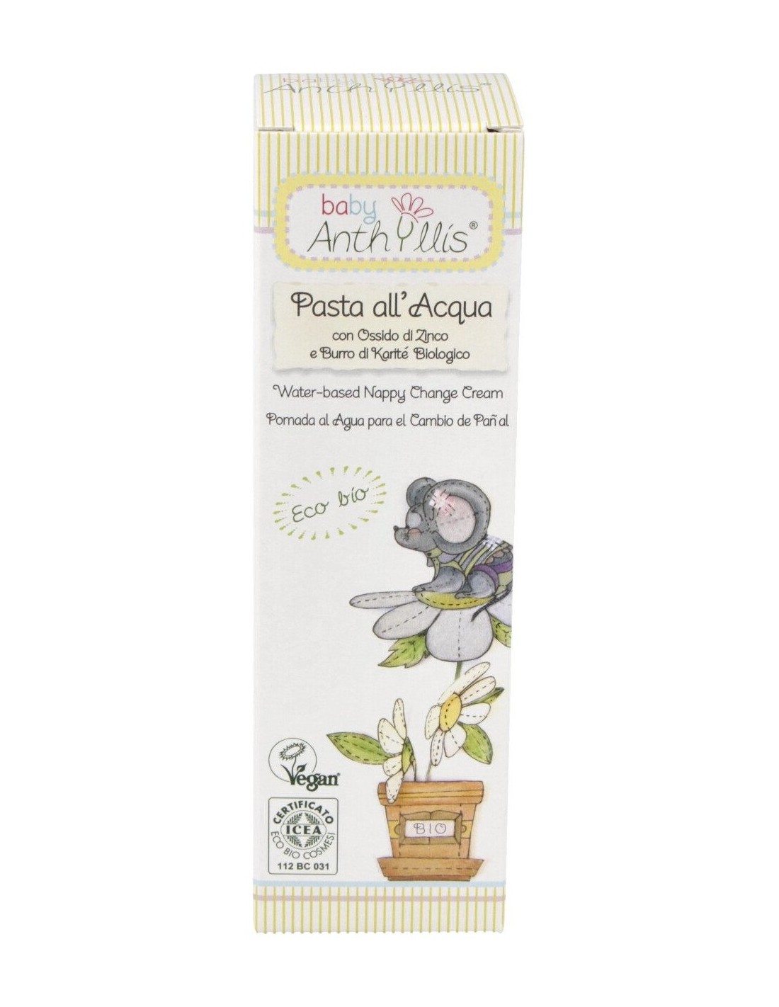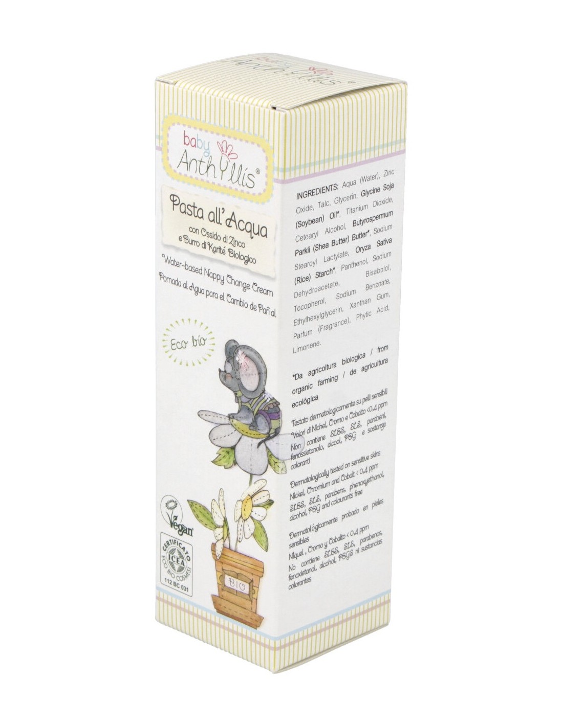 Pomada a base de Óxido de Zinc, Manteca de Karité y Almidón de Arroz, para el cambio de pañales. Previene enrojecimientos e irrita-ciones del culito de bebés y niños, aislando la piel de todas las impurezas. De elevado contenido lipídico y textura suave, que se aplica y luego se limpia fácilmente. Cubre muy bien, protege y mantiene íntegra la delicada piel de los niños, especialmente en las zonas del culito y de los genitales. Rica en aceites eudérmicos, de propiedades lenitivas. El óxido de zinc favorece la normalización de las zonas irritadas y previene el desarrollo de las bacterias, protegiendo la piel de orina y heces. La manteca de Karité alivia las sensaciones de malestar y suaviza la piel. La glicerina aporta su acción hidratante. Producto de elevada tolerabilidad, estudiado para minimizar los riesgos de alergia. Testado dermatológicamente sobre pieles sensibles. Controlado su contenido en Níquel, Cromo y Cobalto. Apto para veganos.