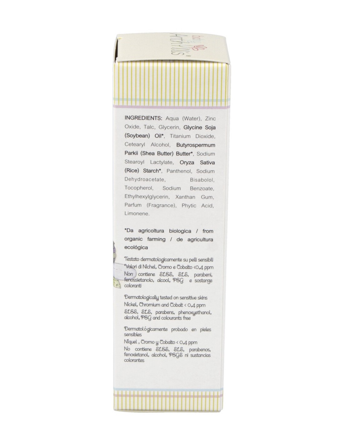Aqua, Zinc Oxide, Talc, Glycerin, Glycine Soja Oil*, Titanium Dioxide, Cetearyl Alcohol, Butyrospermum Parkii Butter*, Sodium Stearoyl Lactylate, Oryza Sativa Starch*, Panthenol, Sodium Dehydroacetate, Bisabolol, Tocopherol, Sodium Benzoate, Ethylhexylglycerin, Xanthan Gum, Parfum (Perfume certificado por Icea), Phytic Acid, Limonene.