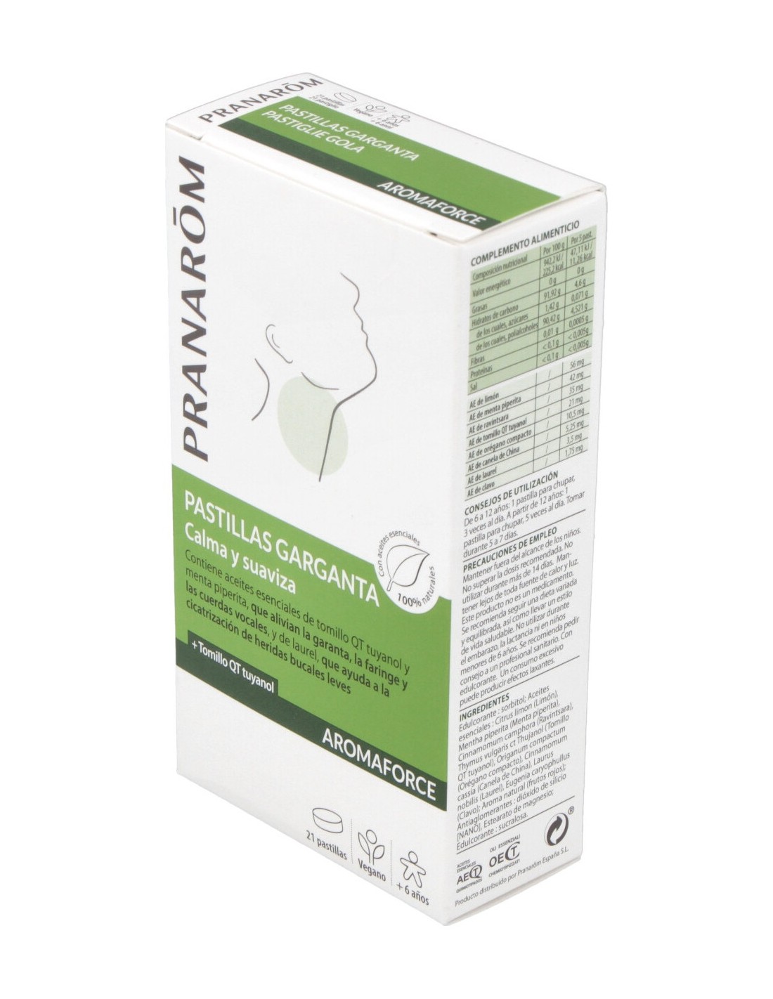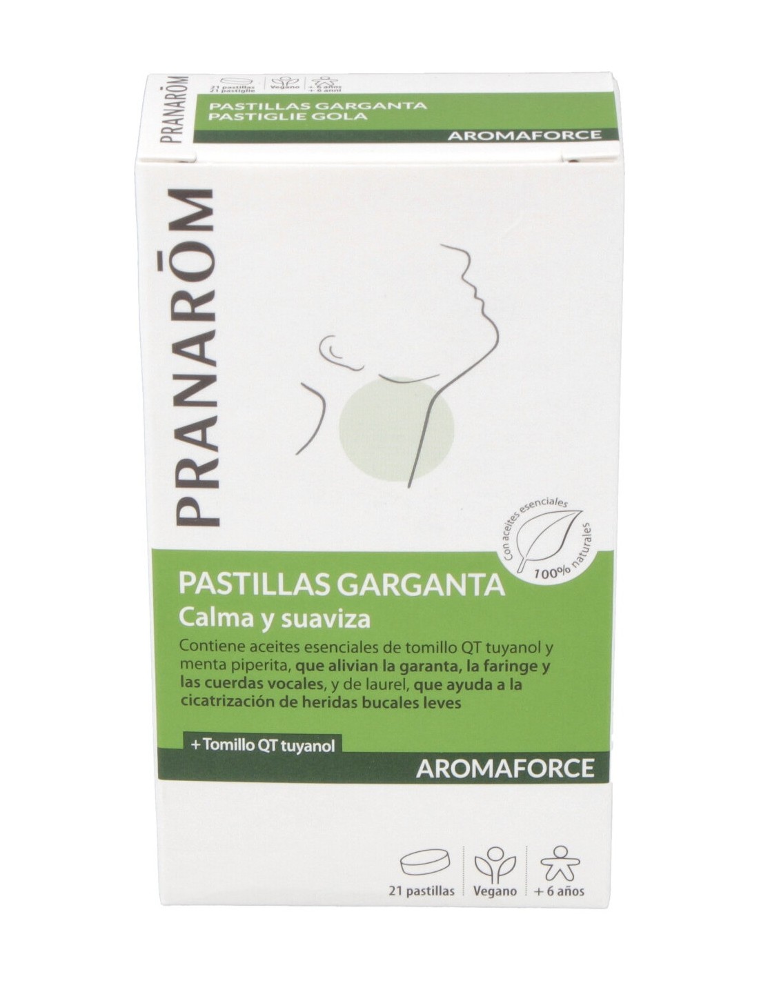 Pranarom Aromaforce Pastillas Garganta 21uds es un complemento alimenticio en formato pastillas calmantes para la garganta son unas pastillas destinadas a aliviar las molestias leves de garganta de una manera natural.