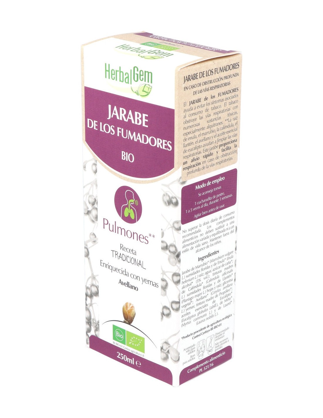 Herbalgem Jarabe de los Fumadores 250ml es un jarabe biológico que ayuda a limpiar las vías respiratorias y los pulmones de fumadores o exfumadores, además de acabar con la tos.