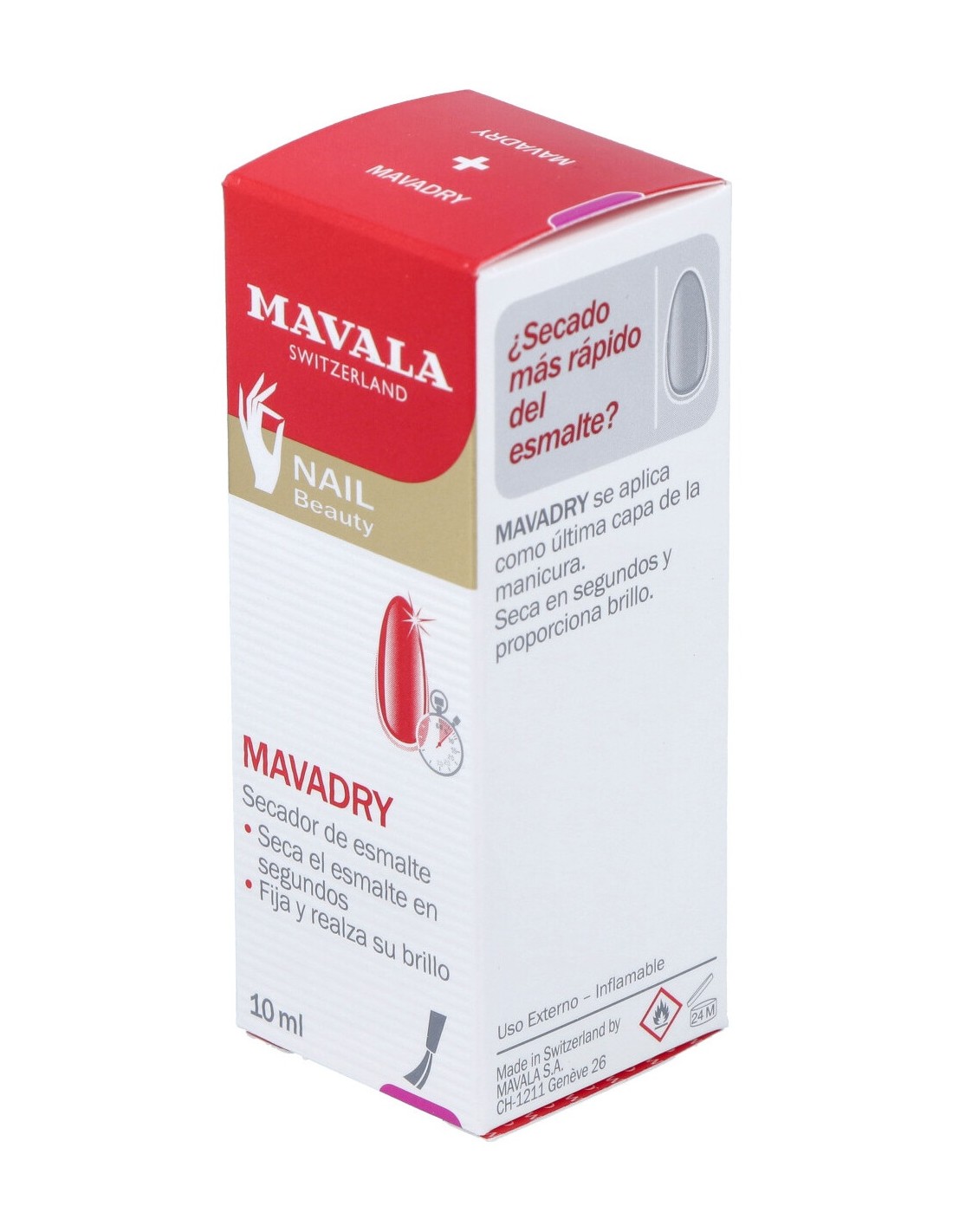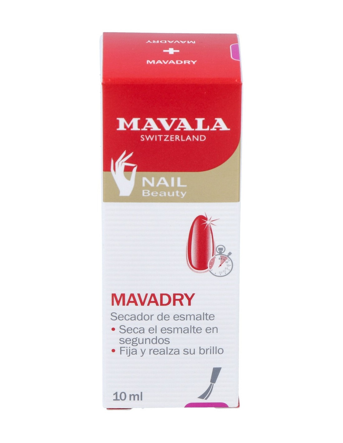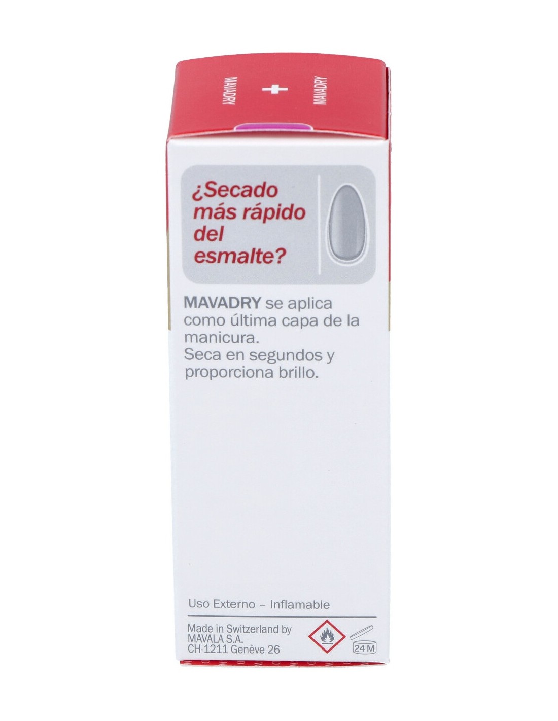 Después de la última capa de esmalte, esperar 1 minuto y aplicar MAVADRY en toda la superficie de la uña. En 1 minuto, el esmalte de uñas estará seco al tacto con un aspecto brillante.