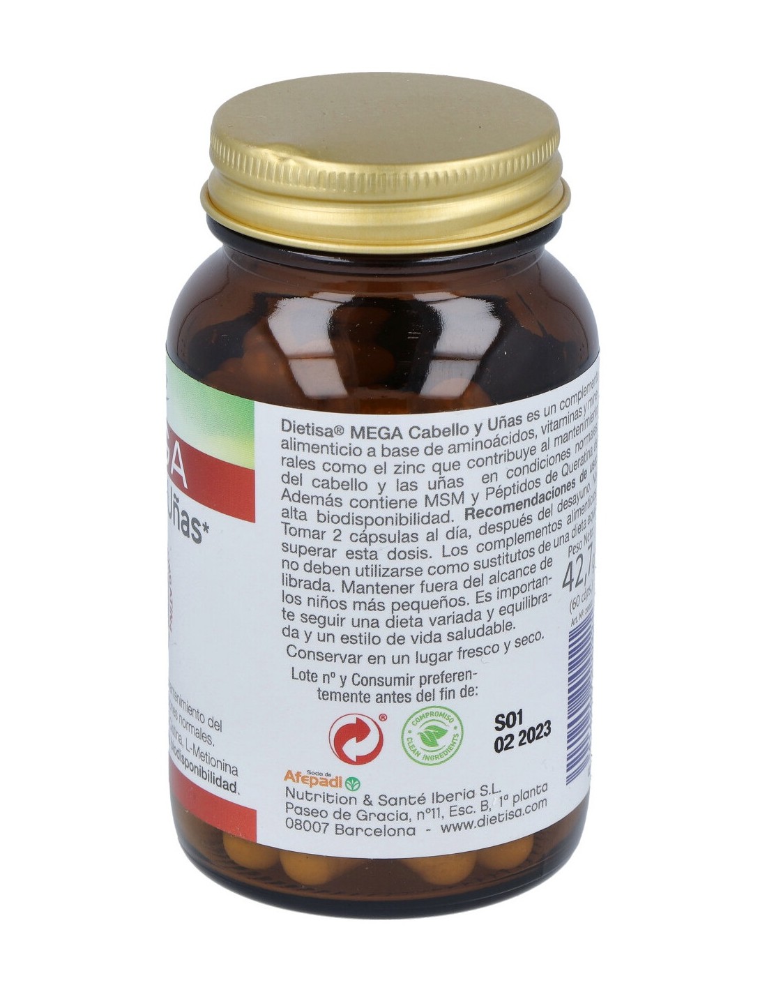 L-cistina (150 mg), Dióxido de Silicio, Sílice, Sulfato de Zinc, Gluconato de Cobre, Celulosa microcristalina, Extracto seco de bambú, Levadura de selenio, Fumarato de hierro, L-Metionina, Clorhidrato de piridoxina, D-biotina, Sales magnésicas de ácidos grasos, Péptidos de queratina, MSM.