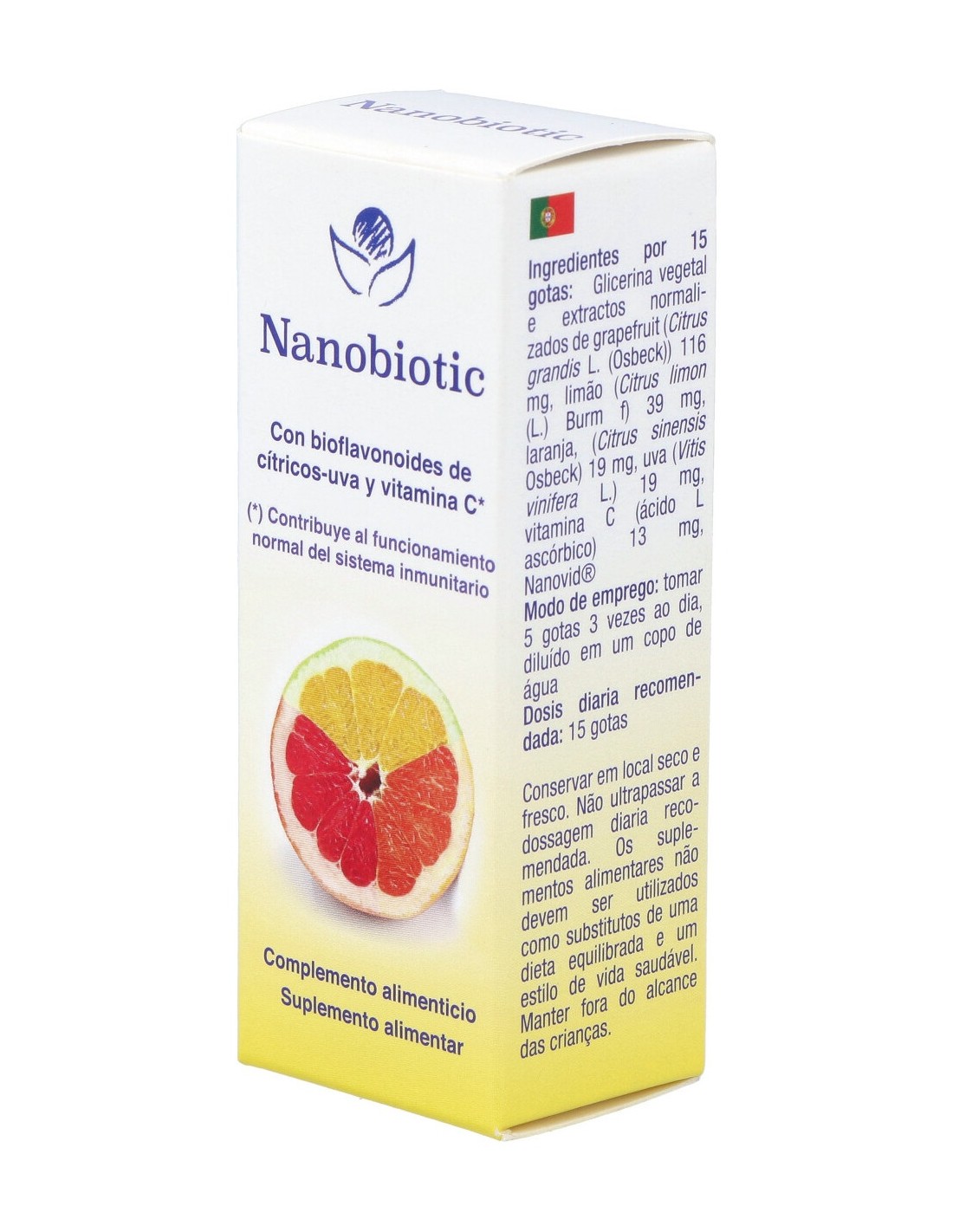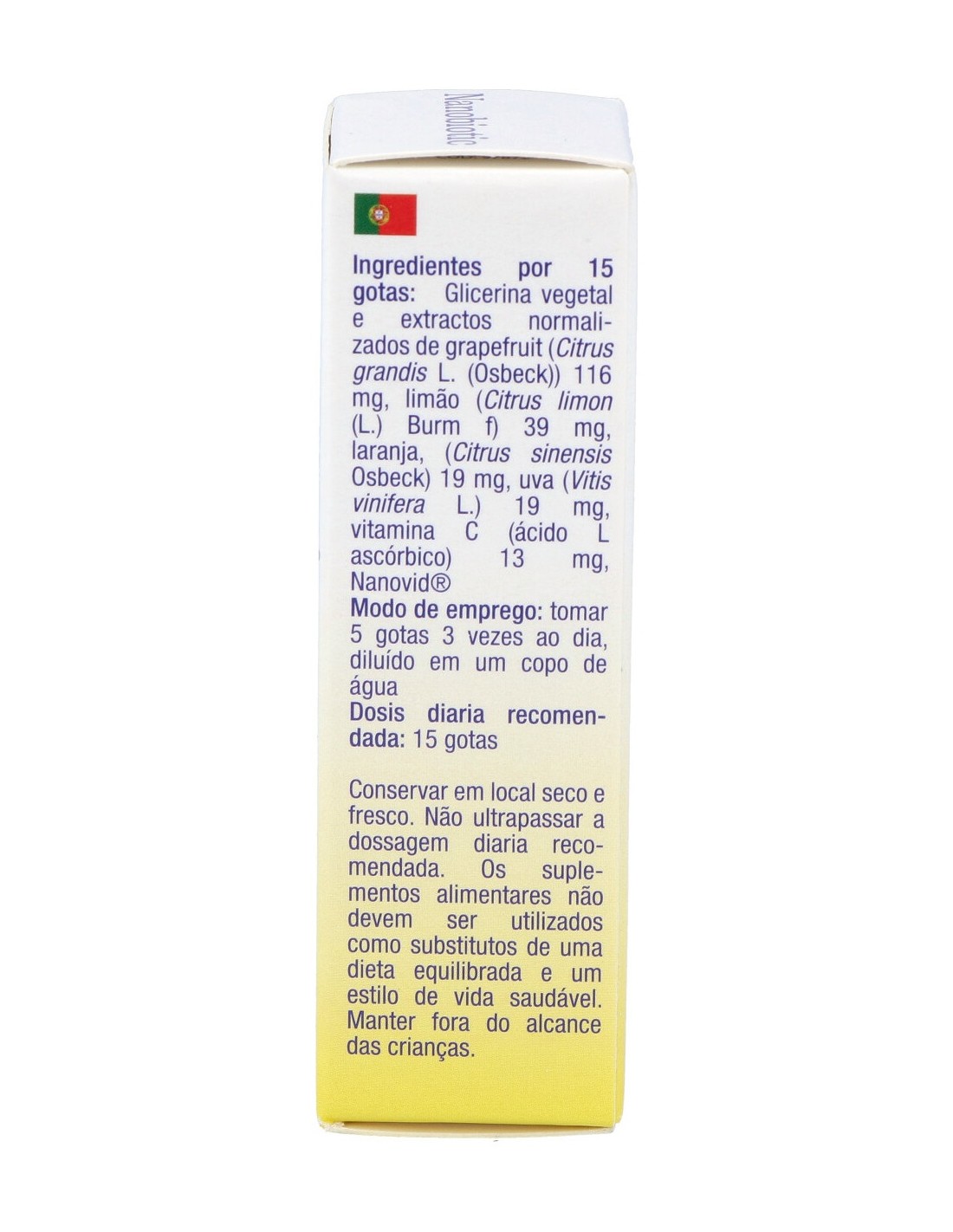 Ingredientes por 15 gotas: glicerina vegetal y extractos estandarizados de pomelo ((Citrus grandis L. (Osbeck)) 116 mg, limón ((Citrus limon (L. )Burm f)) 39 mg, naranja (Citrus sinensisOsbeck) 19 mg, uva (Vitis vinifera L.) 19 mg, vitamina C (ácido L ascorbico) 13 mg, Nanovid®.