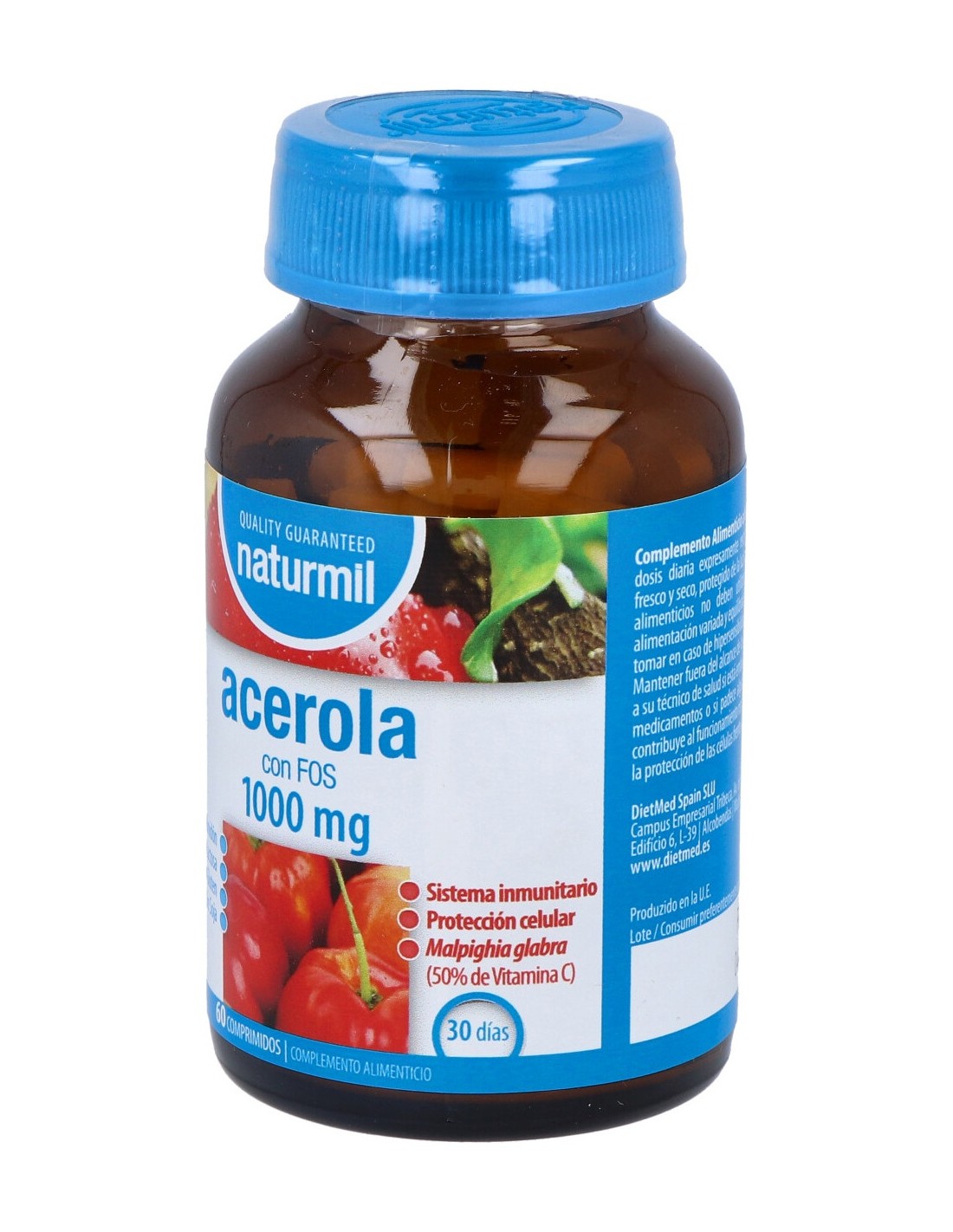 Acerola 2000 mg (contiene al menos 1000 mg de Vitamina C, 1250% VRN*), FOS 300 mg.