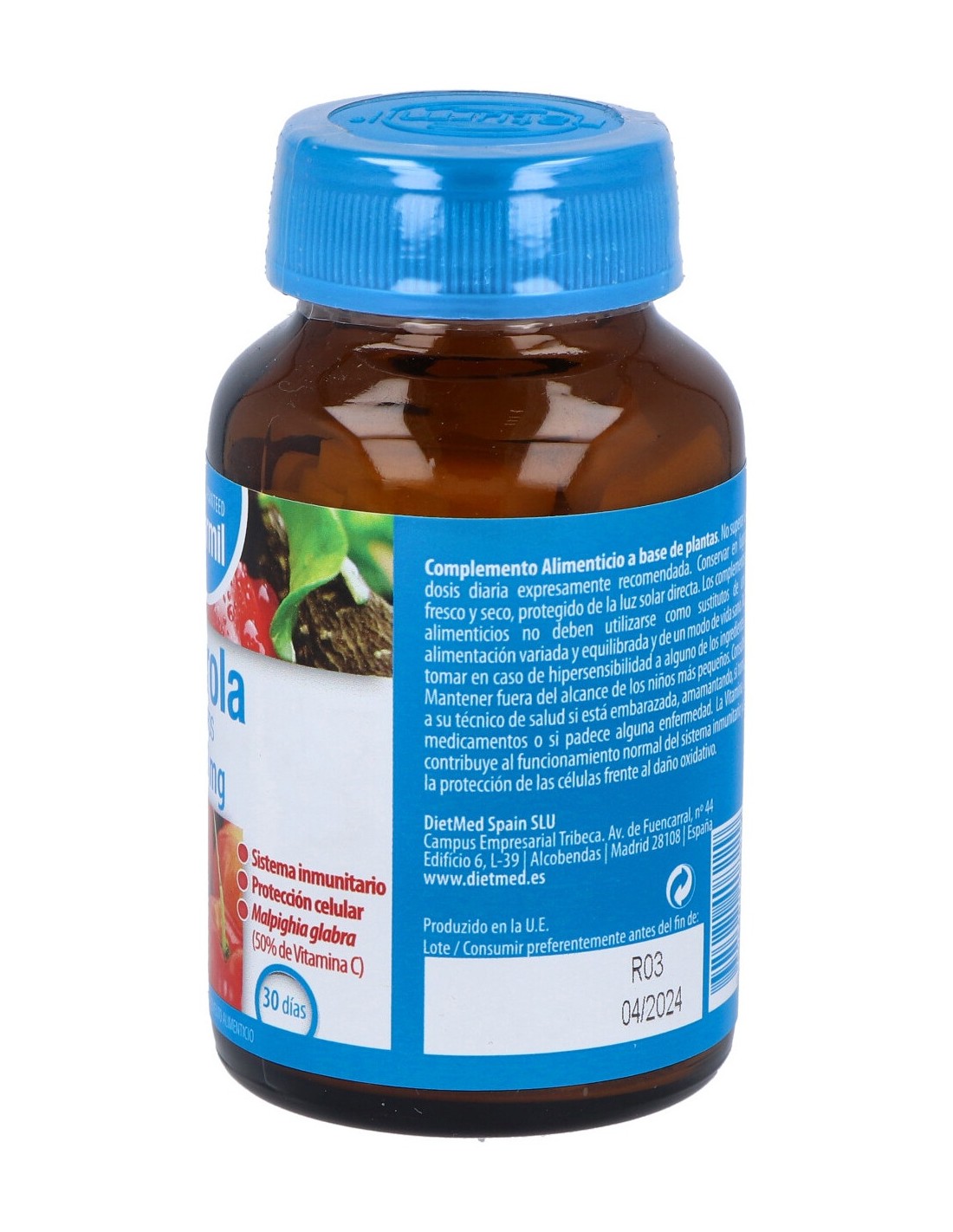 Malphighia glabra (Acerola: extracto seco conteniendo al menos 50% de Vitamina C), agente de carga: celulosa microcristalina, FOS (fructooligosacáridos), antiaglomerante: estearato de magnesio, dióxido de silicio.