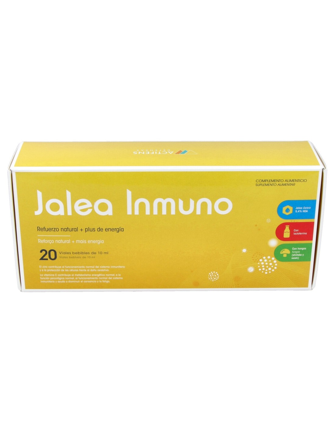 Formulado con ingredientes de reconocida actividad y respuesta inmunitaria, utiliza jalea real con un mínimo de 5,4% de HDA, el cual refleja su calidad y pureza. El zinc contribuye al funcionamiento normal del sistema inmunitario y a la protección de las células frente al daño oxidativo. La vitamina C contribuye al metabolismo energético normal, a la función psicológica normal, al funcionamiento normal del sistema inmunitario y ayuda a disminuir el cansancio y la fatiga.