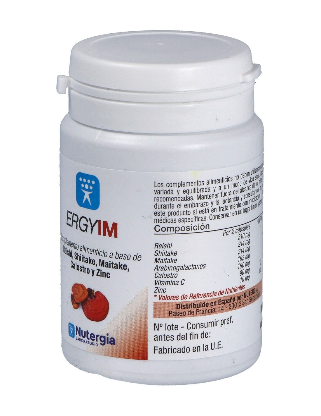 Extracto bio de reishi (Ganoderma lucidum), cápsula vegetal (HPMC), extracto bio de shiitake (Lentinula edodes), arabinolagactanos, extracto bio de maitake (Grifola frondosa), calostro bovino purificado, zinc, vitamina C.