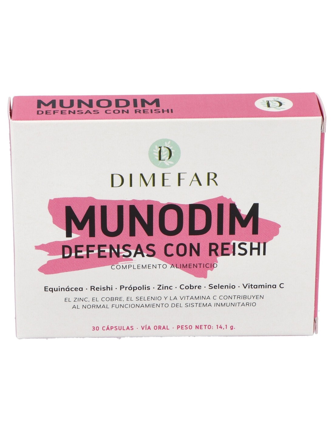 Dimefar Munodim 30Cáps es un complemento alimenticio elaborado con extractos valorados de equinácea, reishi y própolis y complementado con vitamina C, Zinc, Cobre y Selenio, combinación que contribuye a fortalecer las defensas y a mantener el sistema inmunitario en óptimo estado de salud. De esta manera, el organismo está más preparado para combatir las agresiones externes, virus y bacterias eficazmente.