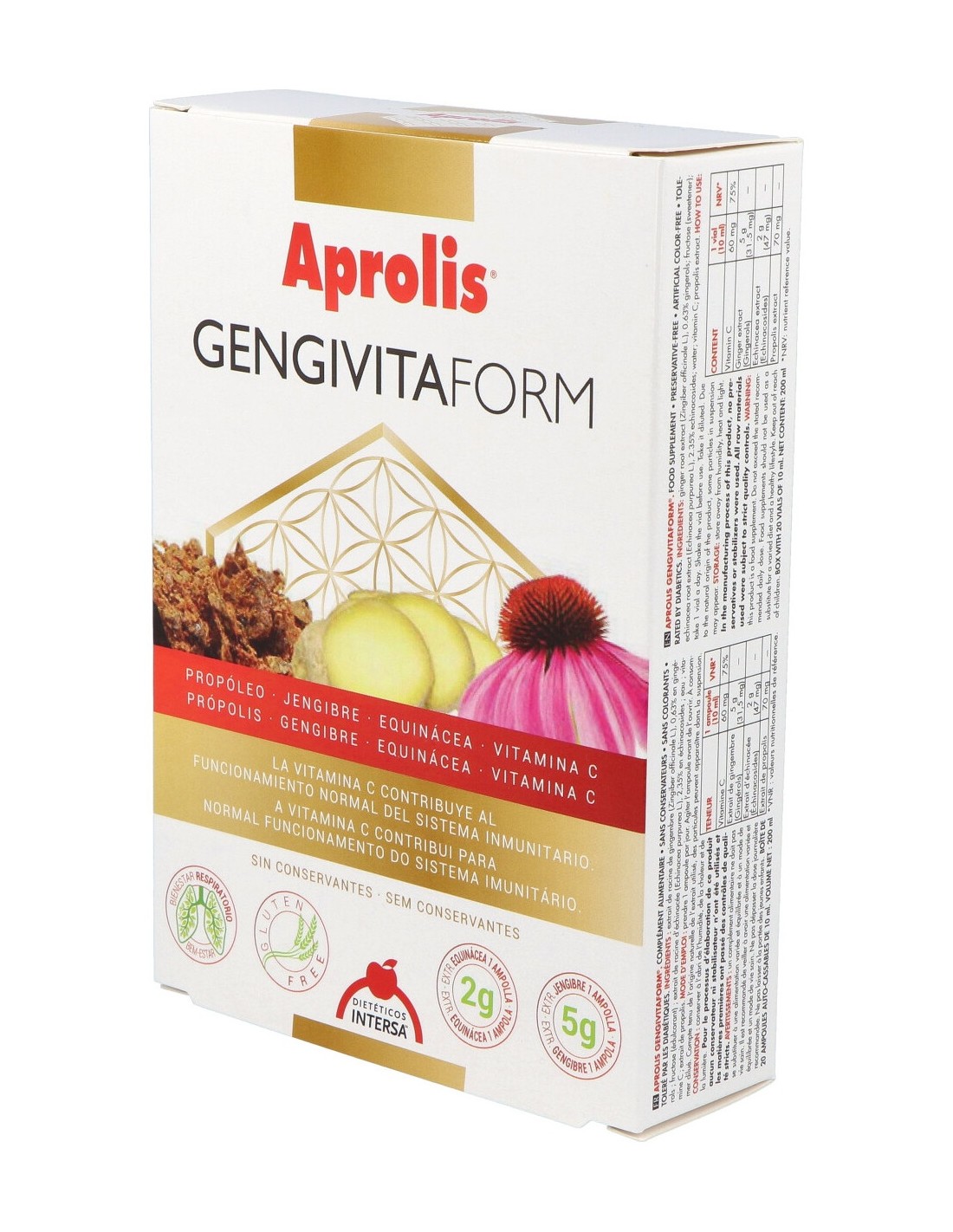 Estas ampollas cuentan con una combinación de propóleo, jengibre, vitamina C y esquinacea. Una ampolla contiene 5 gramos de extracto de rizoma de jengibre y 2 gramos de extracto de equinácea. El rizoma se ha utilizado desde siempre en la medicina china para brindar calor al pulmón en momentos de resfriado. Este producto de Intersa apoya al funcionamiento correcto del sistema inmune debido a que posee vitamina C. También la presentación viene en una caja de 20 ampollas de 10ml.