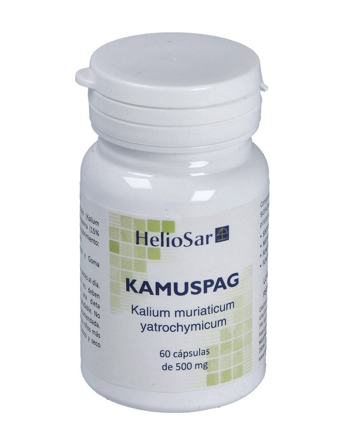 Heliosar Kamuspag. Maltodextrina, cloruro de potasio (kalium muriaticum), clorhidrato de piridoxina (15% VRN de vitamina B6), agente de recubrimiento (sales magnésicas de ácidos grasos), cápsula (hidroxipropilmetilcelulosa, y goma gellan).